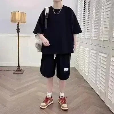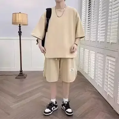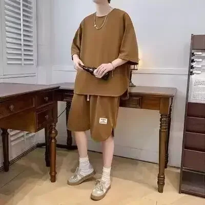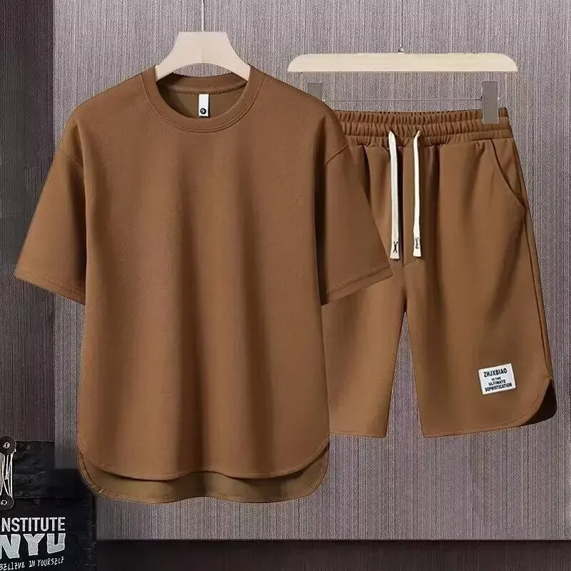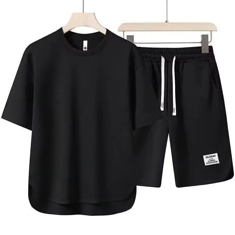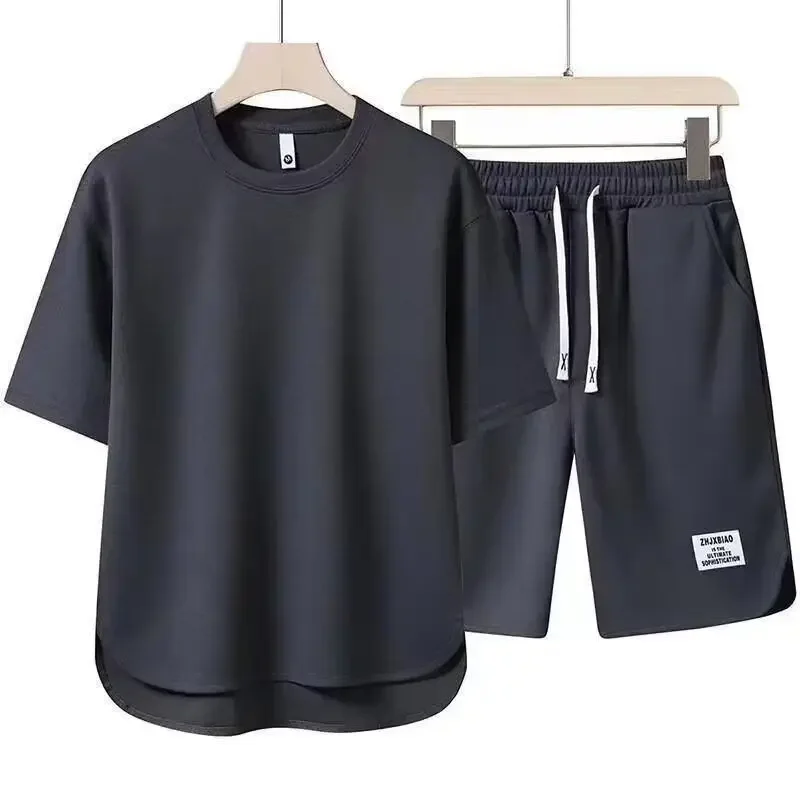 Conjunto de ropa deportiva para hombre elegante y versátil de 2 incluye una camiseta de manga corta de cuello redondo y pantalones cortos deportivos a juego.