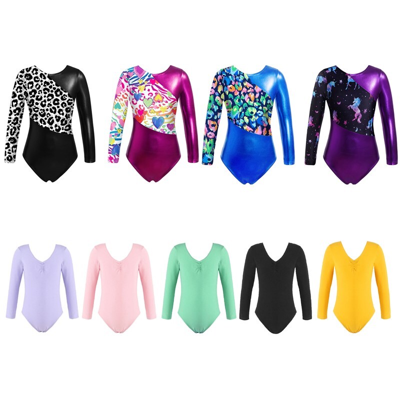 Long sleeves, patchwork, various printed dance leotard, ensures girl free movement.