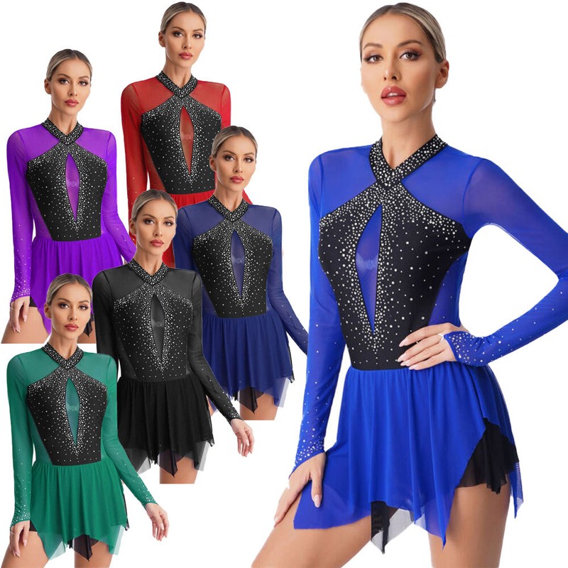 US Women Rhinestone Dress Long Sleeve High Low Hem Roller Gymnastic Dancewear