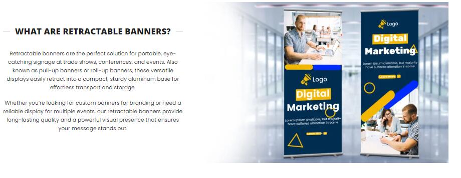 Retractable banners provide maximum portability by pulling out of and retracting into a sturdy aluminum stand or base. This feature makes them the ultimate signage solution for trade shows, events, and conferences.
