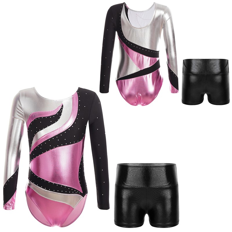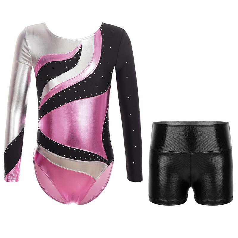 Kids Girls Bodysuit Shiny Leotard With Shorts Rhinestone Jumpsuits WaistbandUSD 14.99