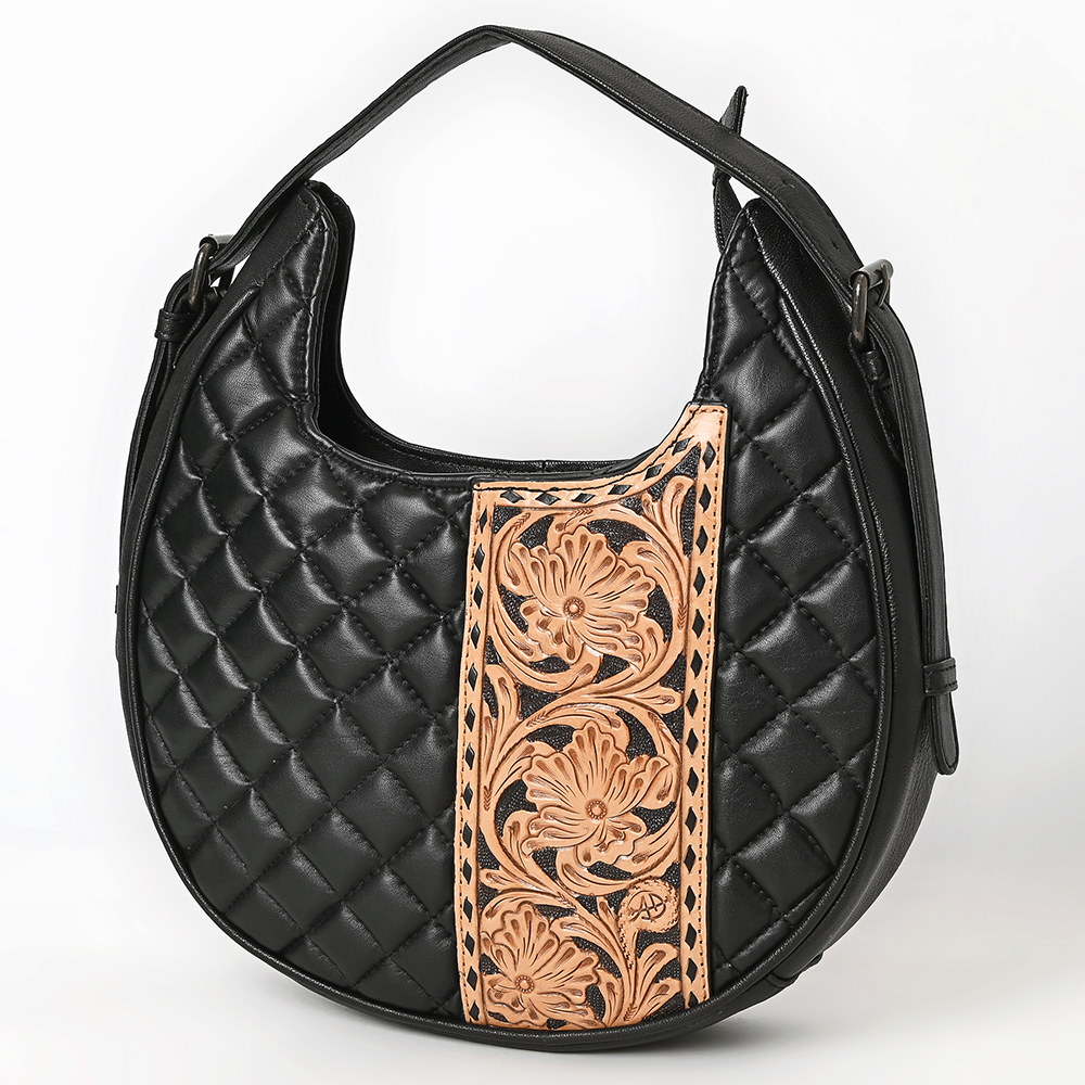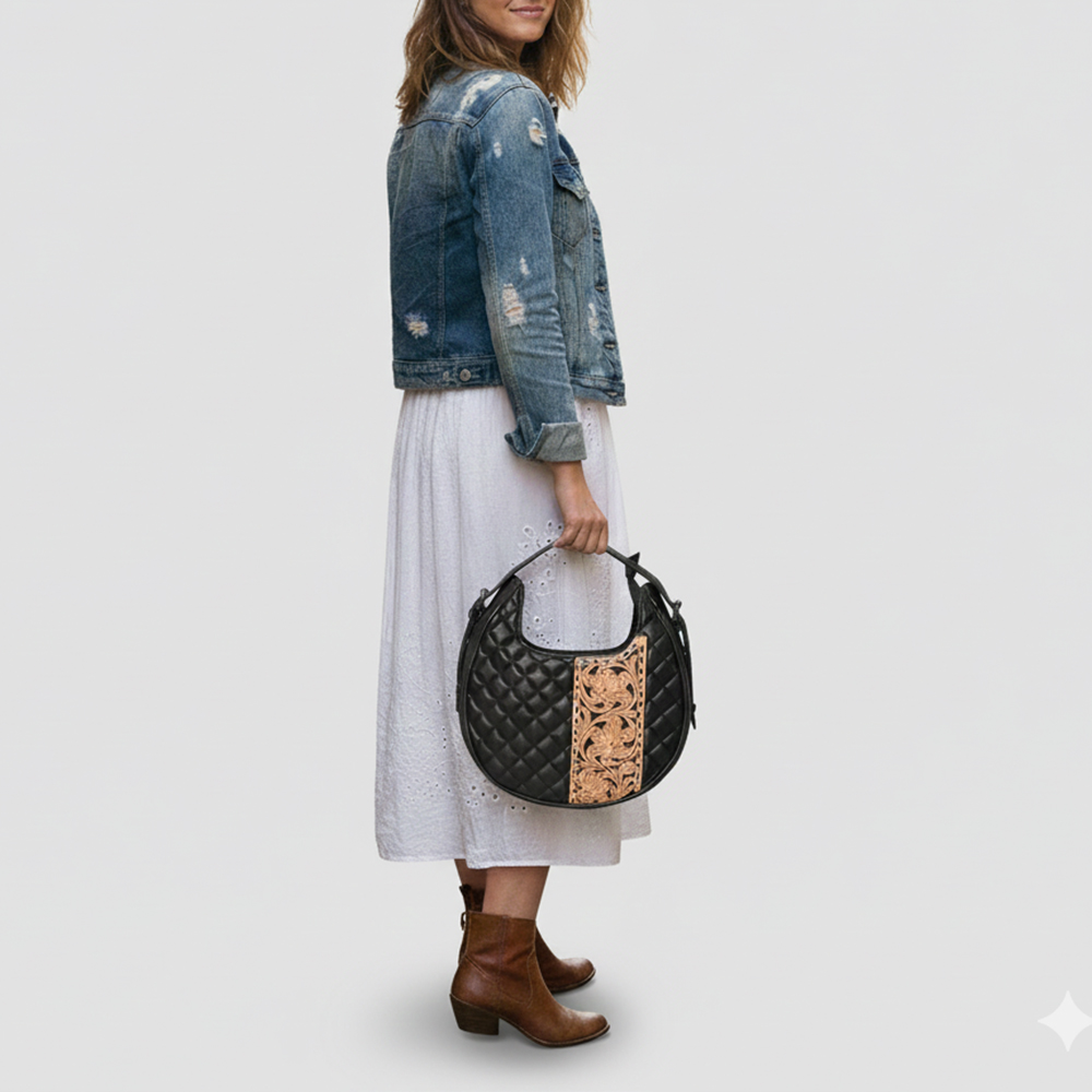 A sophisticated design combining elegant quilting with a rustic Hand Tooled Floral Carved yoke panel in a soft hobo silhouette. This bag is well-compartmentalized, perfect for everyday use, secured by a sturdy YKK Zipper.