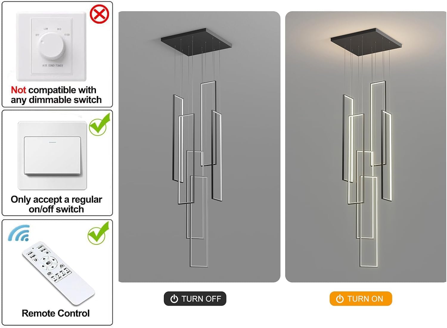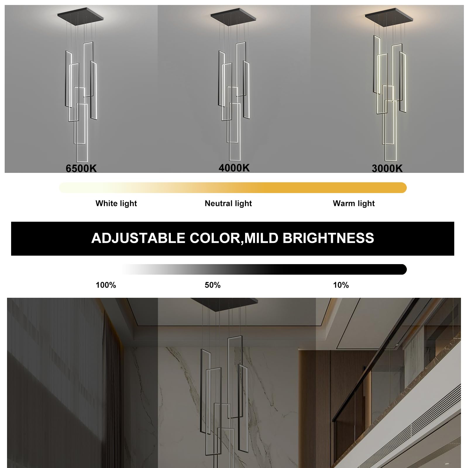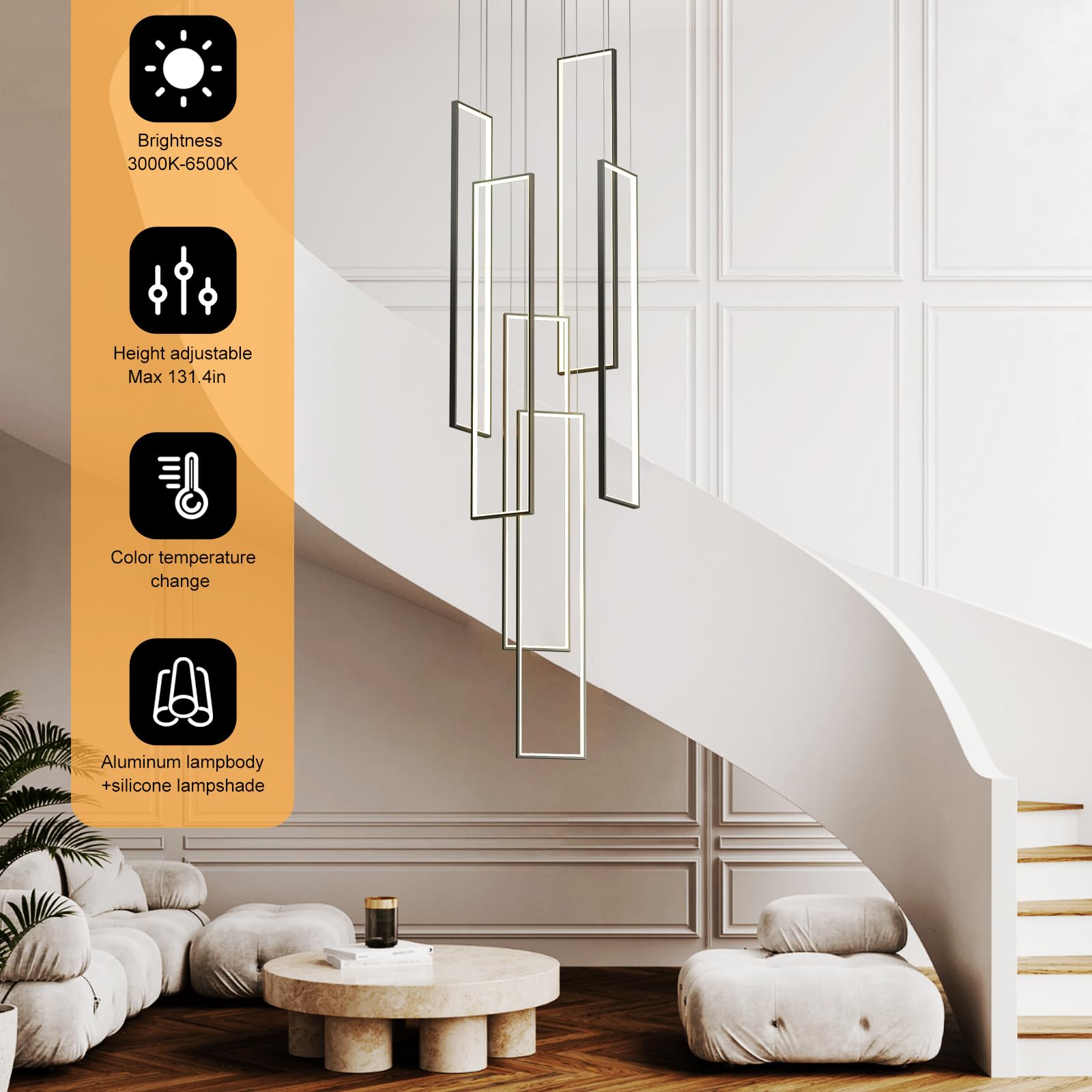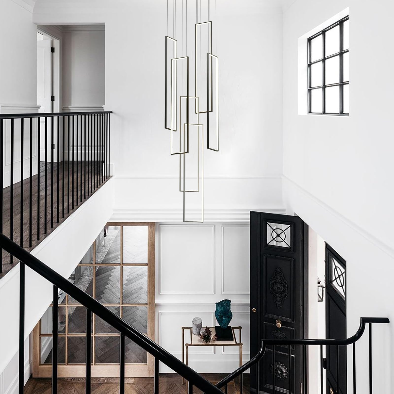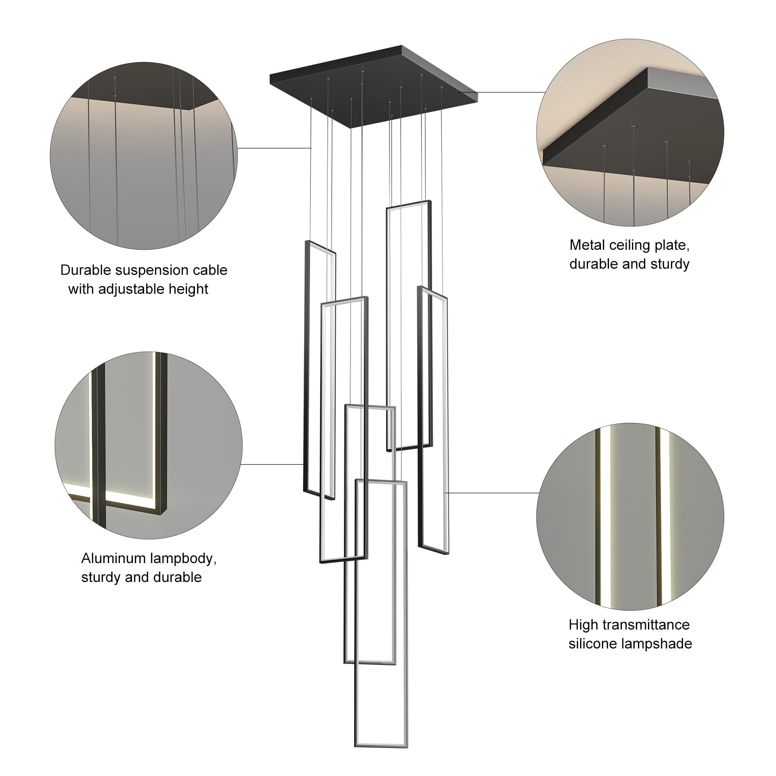 This LED high ceiling chandelier features six sleek square light bodies finished in stylish black, creating a clean, modern look that perfectly complements staircases, living rooms, bedrooms, dining rooms, kitchens, and studies.