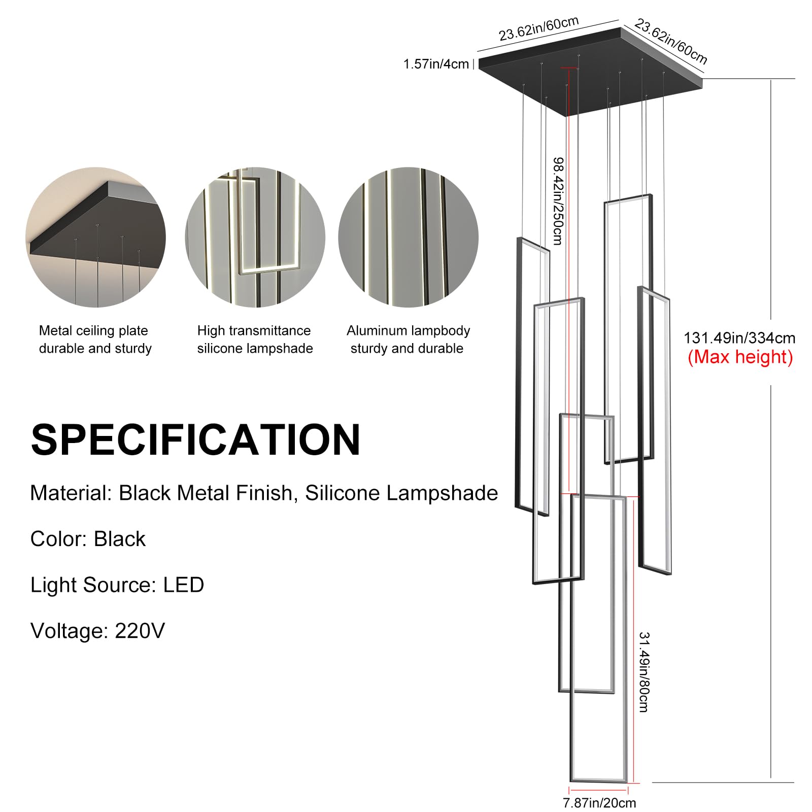 Overall size: L 23.62 in × W 23.62 in × H 131.19 in (60×60×334 cm); Ceiling cover size in L 23.62*W 23.62*H1.57 in(60*60*4cm);each rectangular frame measures approximately 31.49 in × 7.87 in (80×20 cm); adjustable height up to 98.42 in (250 cm). Designed specifically for high-ceiling areas, this piece can be easily adapted to meet your design preferences.