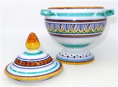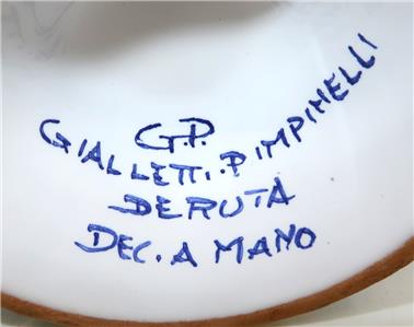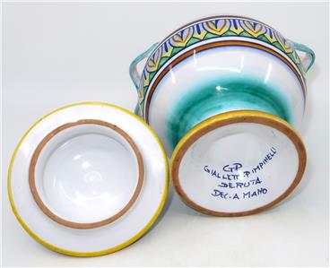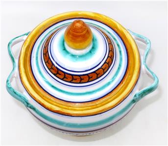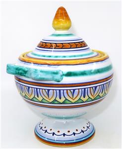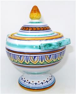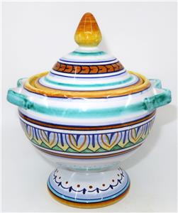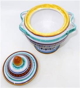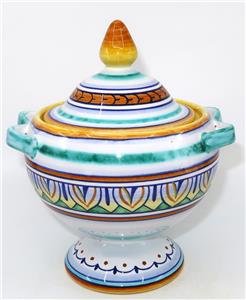 You have found the missing pieces to your art pottery collection! Here is the graceful Deruta Pottery cheese or sugar bowl or jar with lid from GP Gialletti Pimpinelli, Italy. This lovely item is hand-painted in tones of teal, navy, orange, and gold. All of the colors in this palate complement each other beautifully. It includes the lid and would not only be perfect for sugar but would also be nice for storing tea bags in style. Overall, this handy vessel measures 7" tall by 5 1/2" in diameter, 6" wide at the handles. It is in excellent preowned condition. Please see our Not Just China Store for more art pottery and collectibles.