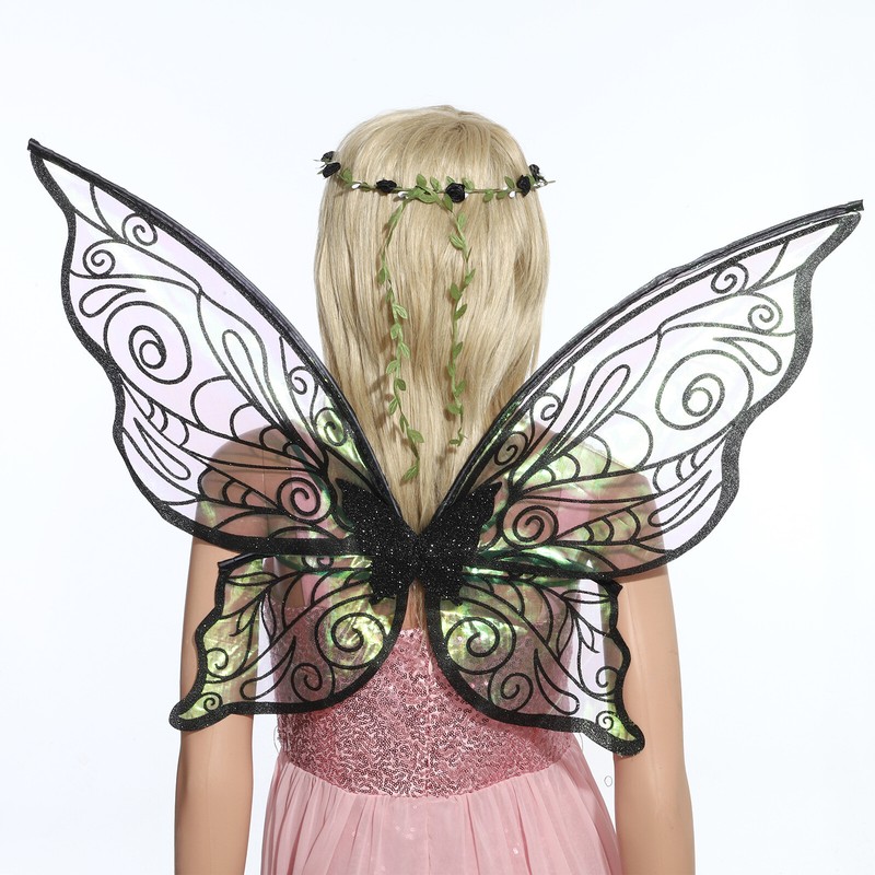 Elastic strap butterfly shape wings with sparkly material decorated, comes with a pair of elf ears, a fairy stick and an exquisite garland.