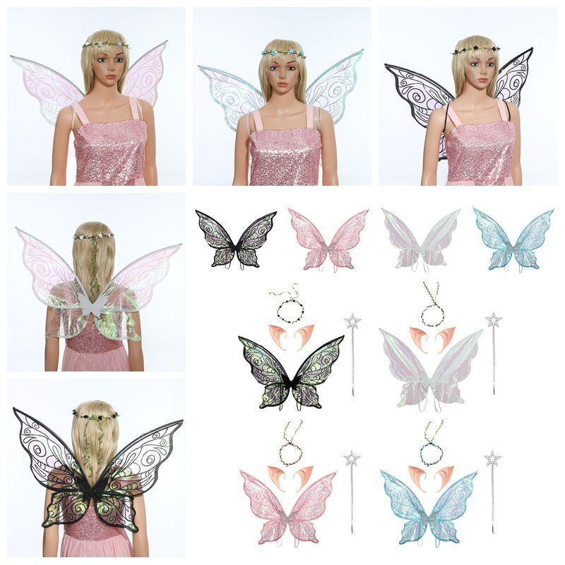 You will receive a set of women girls cosplay props elastic strap sparkly material decorated butterfly wings elf ears fairy stick garland for themed party photography.
