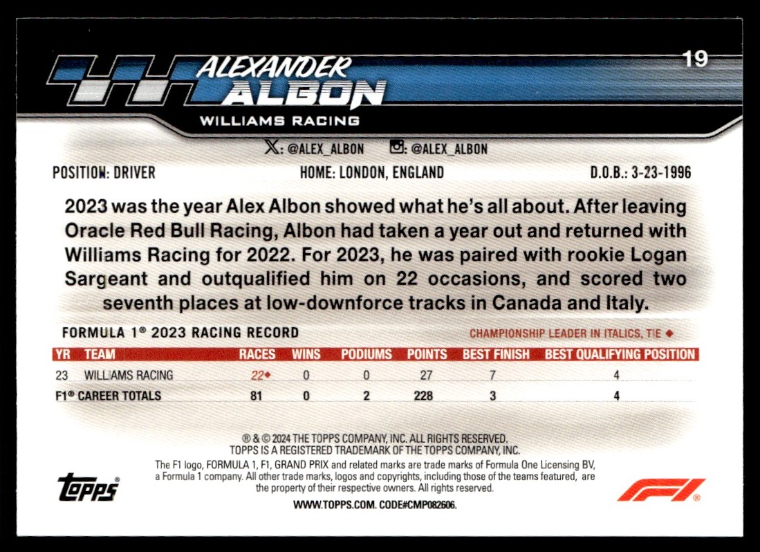 | ALEXANDER ALBON 2024 Topps Paddock Pass Red Foil F1 Card #19 Williams Racing |