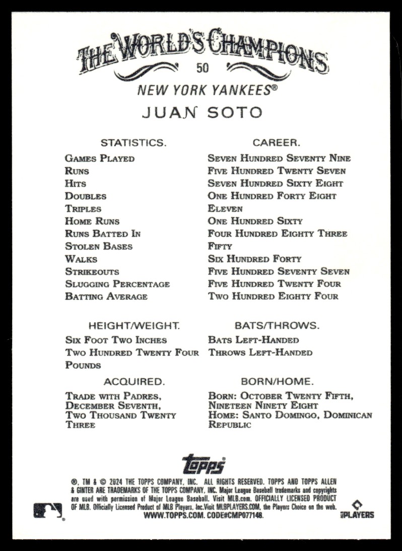 | Juan Soto 2024 Topps Allen & Ginter Card * #50 New York Yankees |
