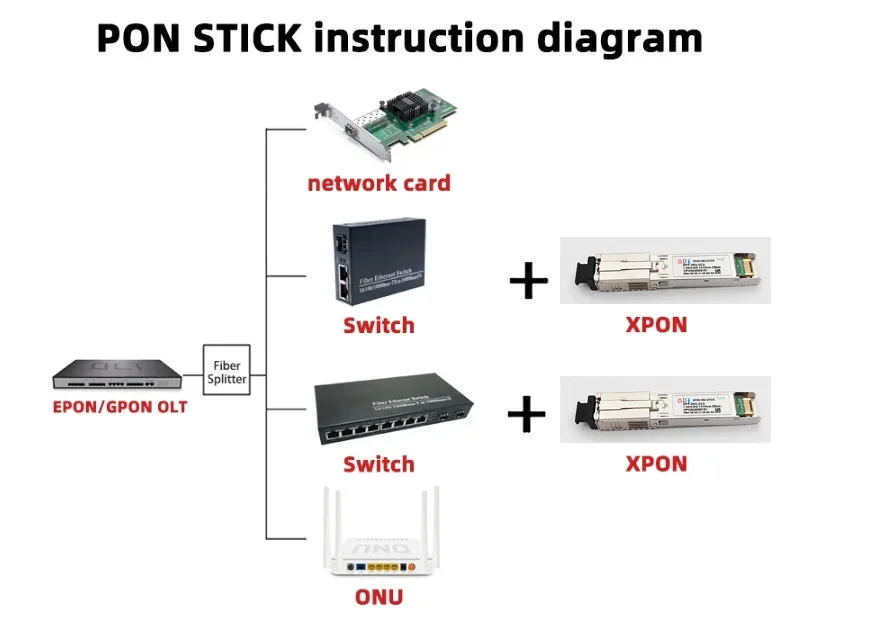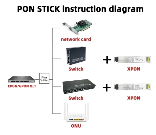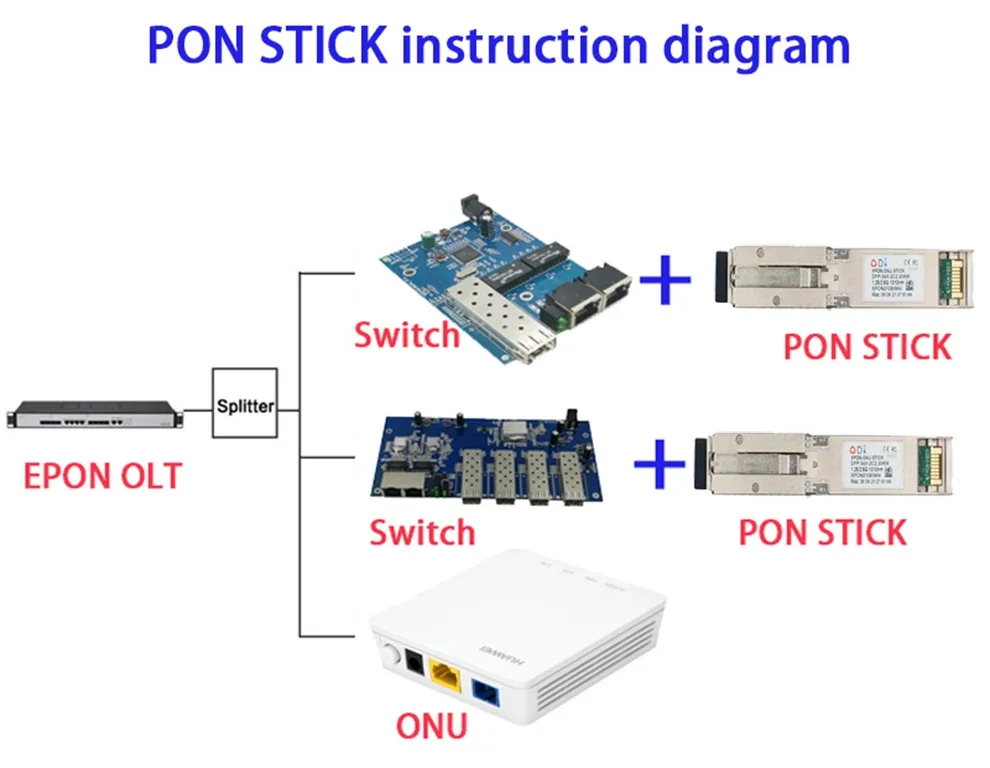 With our modules, any switch and soft router can be turned intothe Optical modemyou want, whether it is GPON or EPON. Theoptical port of the soft router is plugged with our module,and the Optical modem configured by the operator can becompletely removed.