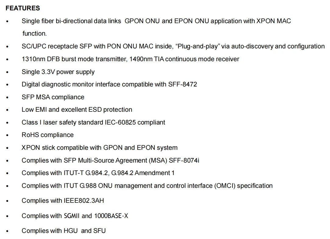 5. Complies with ITU-T G.984.2, G.984.2 Amendment 1