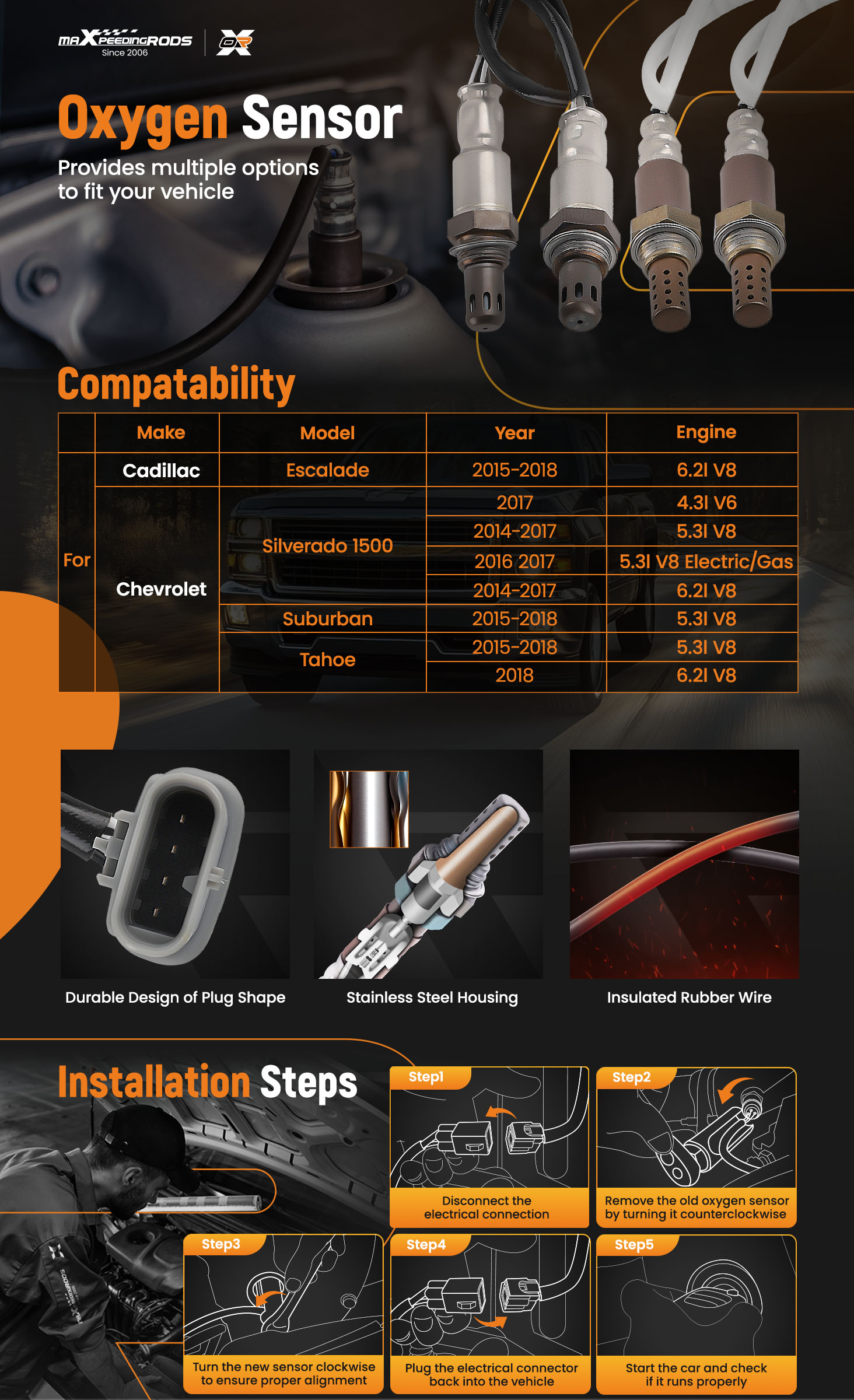 【High Quality Material】The oxygen sensor is equipped with a stainless steel housing. Durable and corrosion-resistant, ensuring your engine's long-lasting and stable performance.