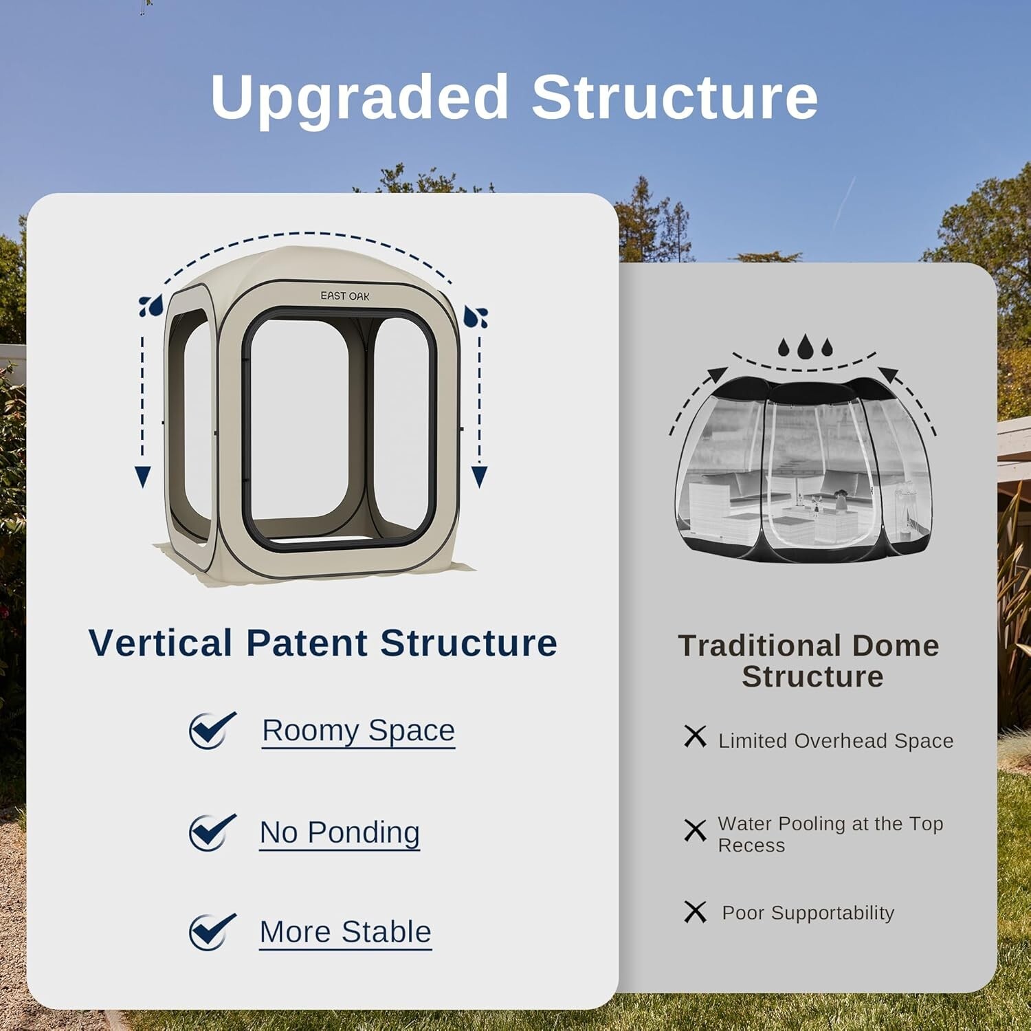 Spacious & Enhanced Stability: Built with durable 300D Oxford fabric and rust-resistant steel, our upgraded design features a heavy-duty fiberglass structure to prevent water accumulation.