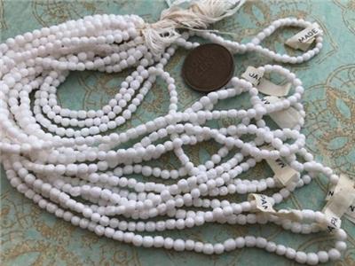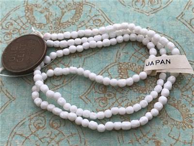 Vintage Cherry Brand dimpled white glass beads. Cherry Brand beads were produced by a large group of farmers throughout the Osaka district of Japan between 1945 and 1952. They produced beads at home by setting up their own flamework stations. Because of their handmade nature, the size and shape varies slightly from bead to bead. These average 3mm in size. You will receive one temporary 15 inch strand with about 125 pieces.