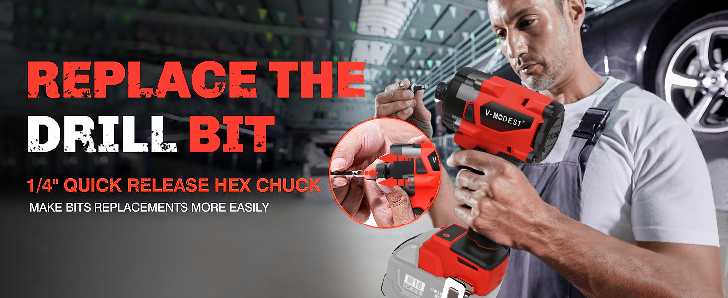 [QUICK RELEASE HEX CHUCK ] This 1/4 inch impact driver is designed with quick release chuck, just pull the chuck forward, you can quickly change the impact driver bits in one second, reduce the trouble of changing the drill driver bit and improve the working efficiency.