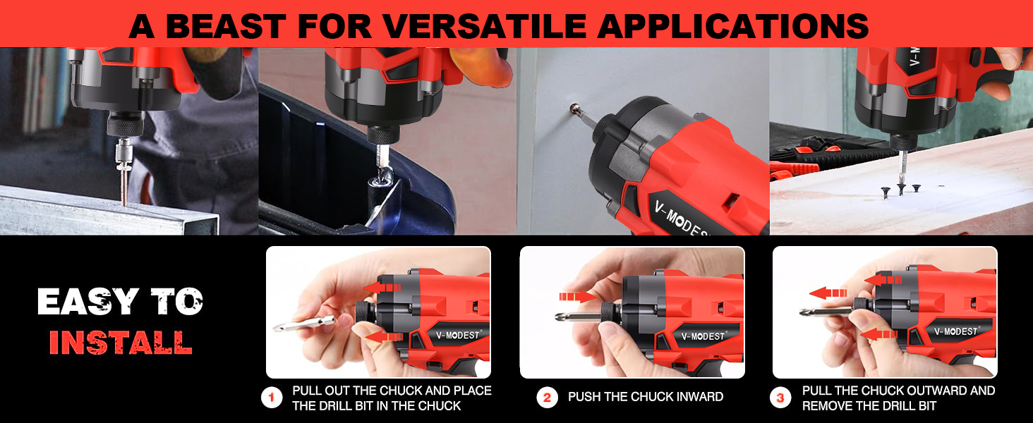 [HIGH TORQUE BRUSHLESS MOTOR] V-MODEST impact driver feature professional grade brushless motors for longer run times, longer motor life and more power. Up to 2303 in-lbs of torque, and 3100 RPM to drive large diameter screws. The V-MODEST 1/4 inch hex chuck cordless driver makes screwing easier .