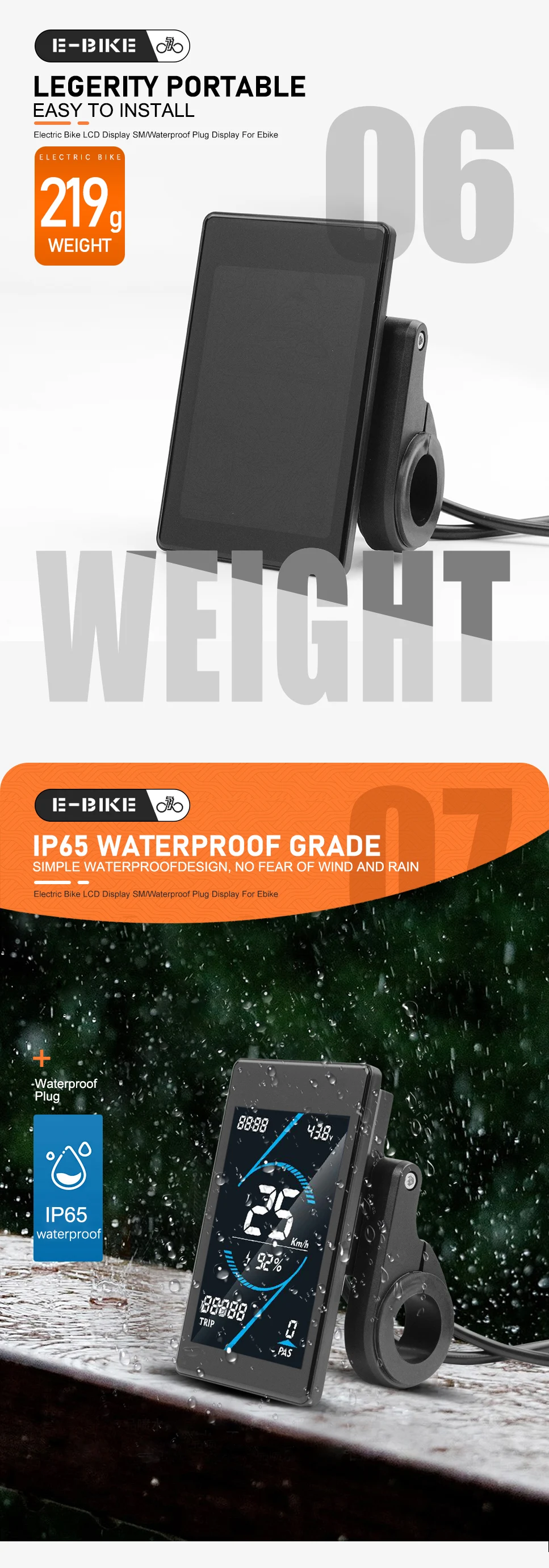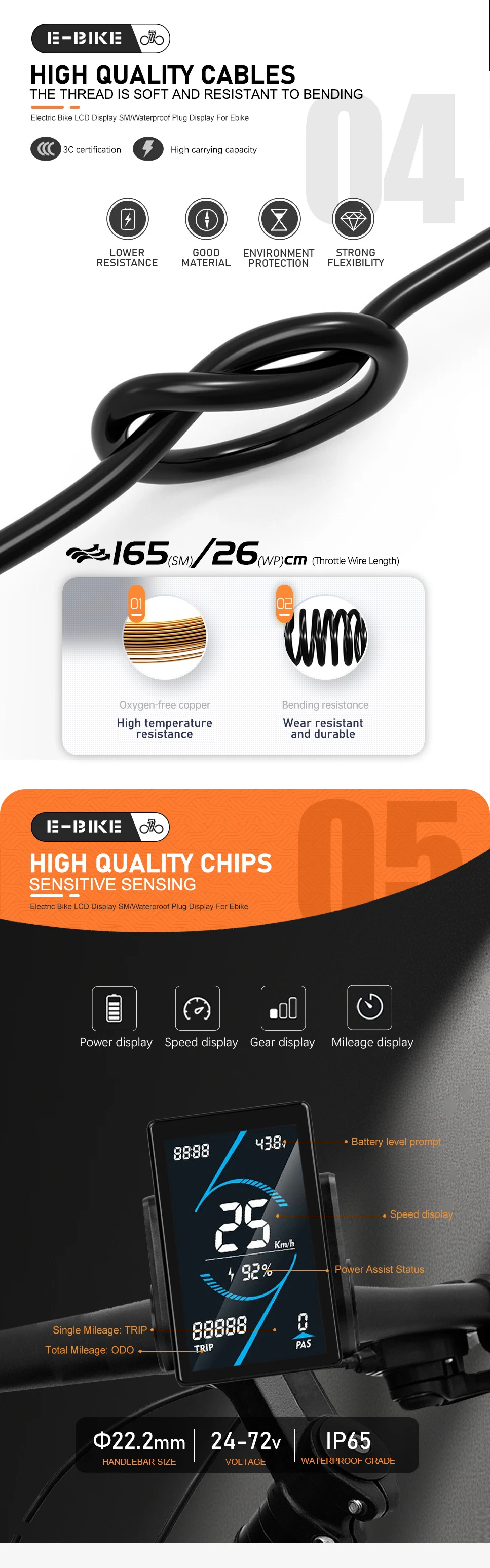 Speed display, gear display, battery indicator, fault prompt, total mileage, single mileage, current voltage, riding time