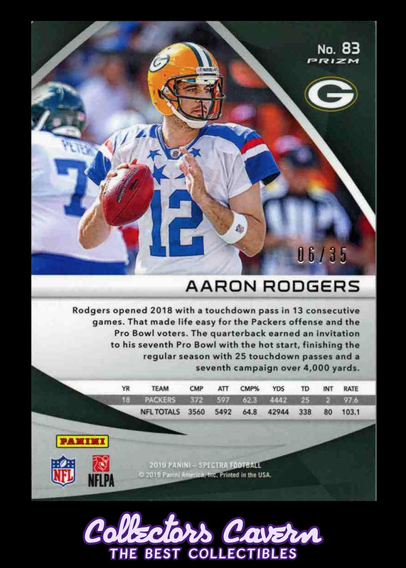 2019 Panini Spectra Neon Green #83 Aaron Rodgers #d 06/35. This card is not graded; but in our opinion in NM or better. Ungraded cards are placed in a card sleeve then top-loader (or Card Saver) and shipped in an envelope.