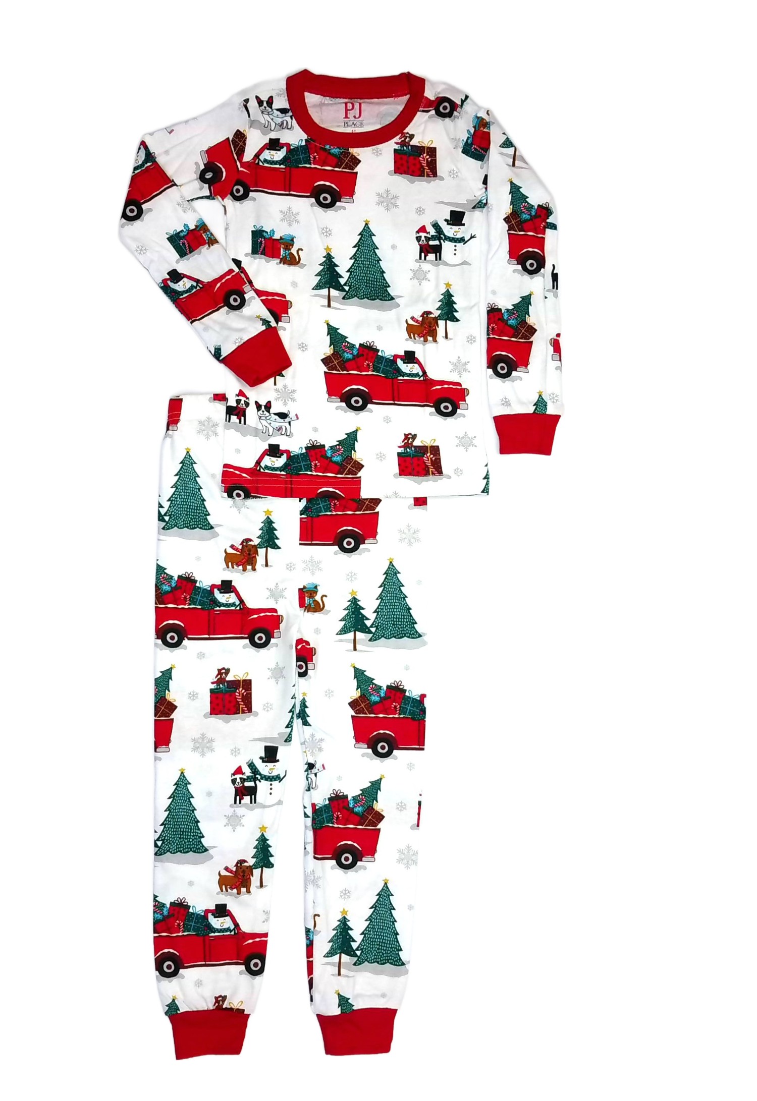 This soft cotton pajama set is perfect for the holidays, providing both comfort and style. The set showcases a vibrant Christmas-themed print that includes a charming snowman driving a retro red pickup truck, along with festive elements like Christmas trees, playful animals, wrapped presents, and delicate snowflakes. The bright red rib-knit collar and cuff trim adds a festive touch, enhancing the overall design. Made from a soft cotton fabric, the pajama set is designed for a snug fit, making it not only cozy but also perfect for lounging during the holiday season. This combination of fun design and comfort ensures that he can enjoy the holidays in style.