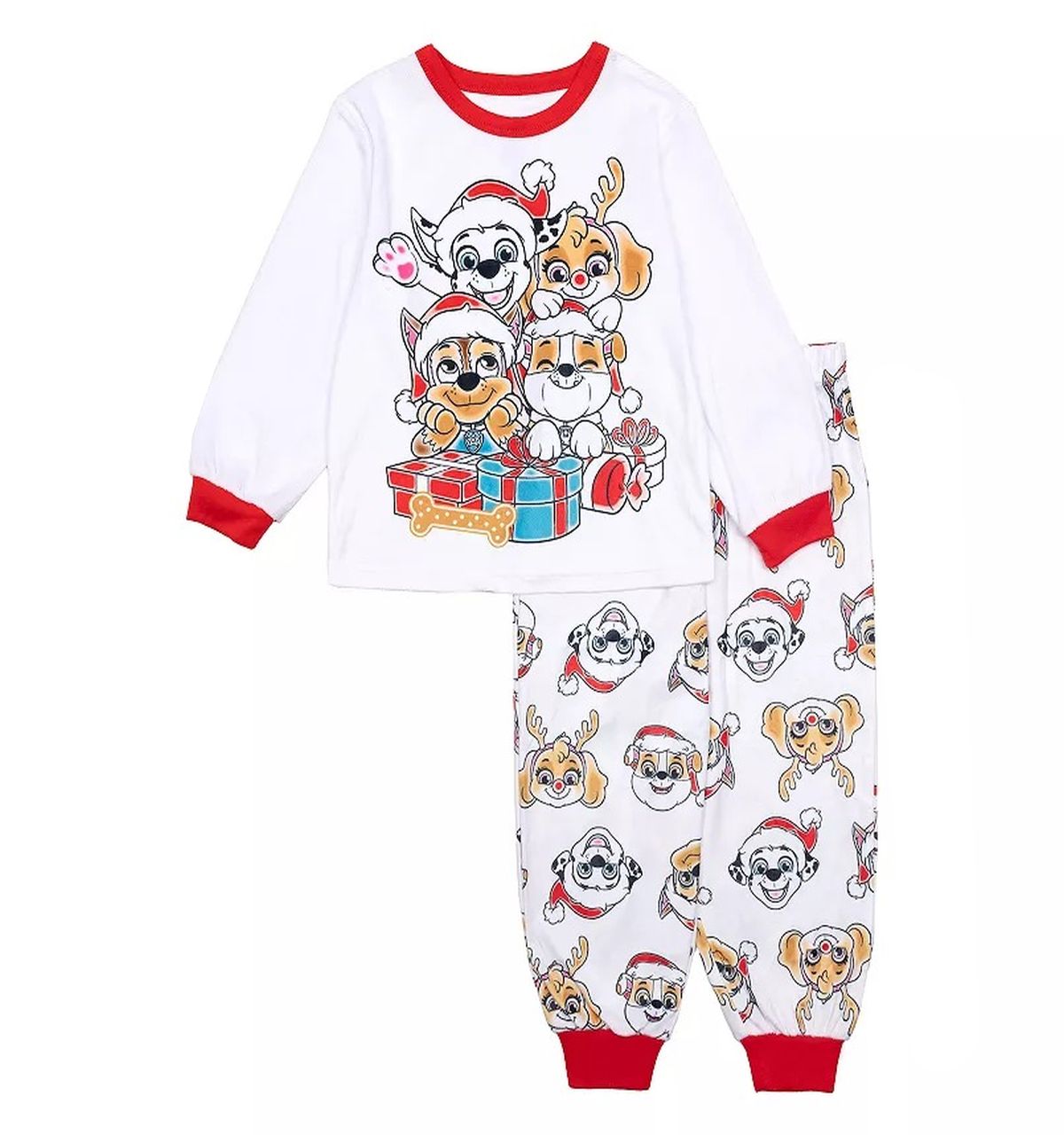 This colorful graphic features their favorite characters, Marshall, Skye, Rubble, and Chase, ready for Christmas in their Santa and Reindeer hats. Bright red rib-knit collar and cuff trim add to its festiveness.