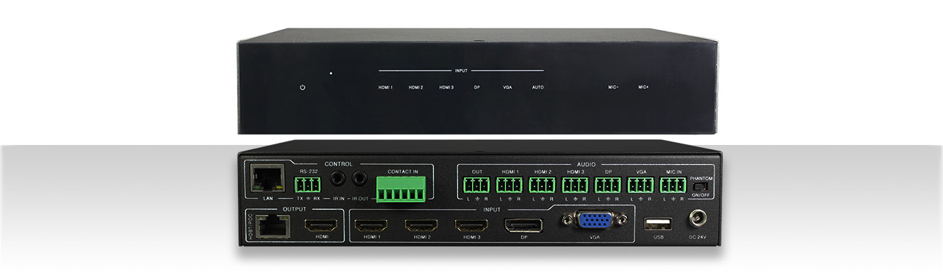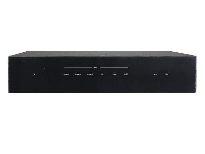 The BZ-SC-51UHD-HDBT Presentation Switcher delivers a crisp 4k@60Hz (4:4:4) resolution supporting 5-Source inputs including 3-HDMI ports, 1-VGA (YPbPr/CVBS) and 1-DisplayPort, with perfect scaling to the HDMI 2.0b output and HDBaseT mirrored outputs. This presentation switcher offers flexible connections for audio which includes unbalanced audio, MIC In and lines out. The audio processor is equipped with an auto-mixer and auto gain control to mix or reduce background sound to amplify the audio source. The unit offers easy configuration and control through IR, Telnet, WebGUI, and RS-232.