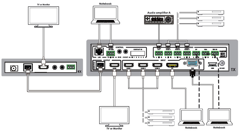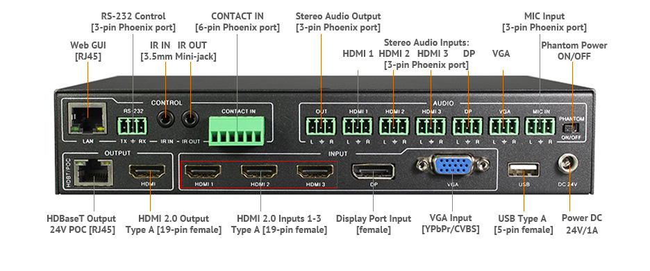 3xHDMI, 1xVGA(YPbPr/CVBS), 1xDisplayPort, 1xMIC In, 4 unbalanced audio input, HDMI and HDBaseT(230ft/70M) outputs (Mirrored)