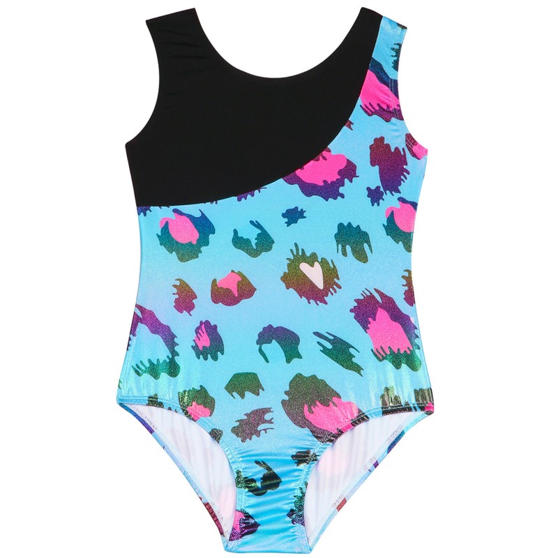 Ein ärmelloser, einteiliger Jumpsuit-Trikot mit Rundhalsausschnitt für Mädchen, passend zu einem elastischen Haargummi.