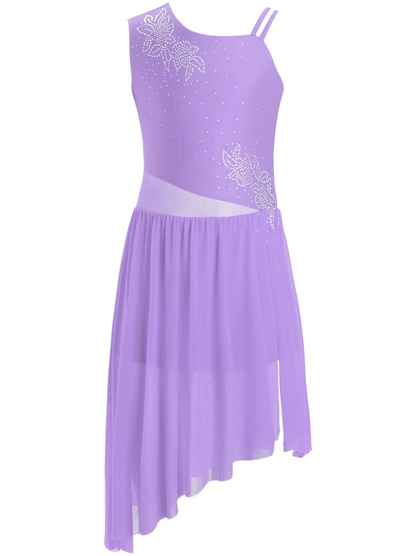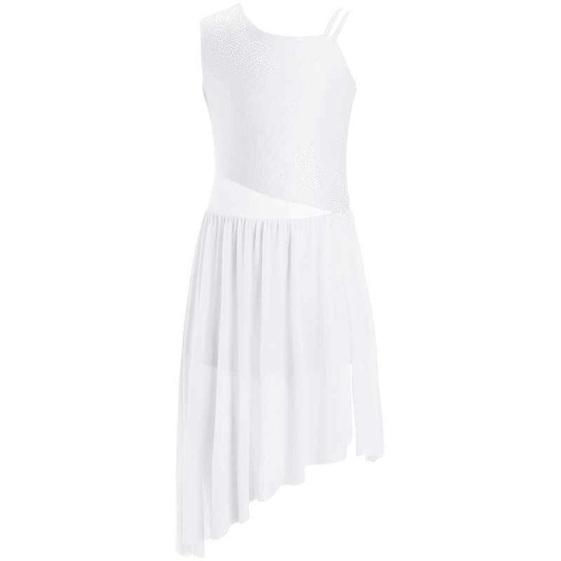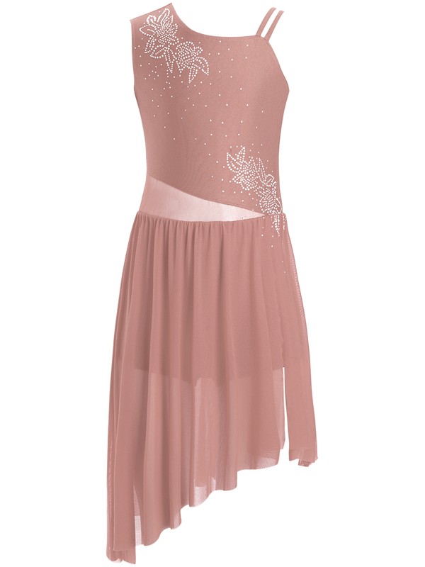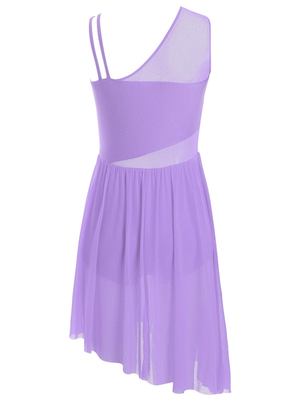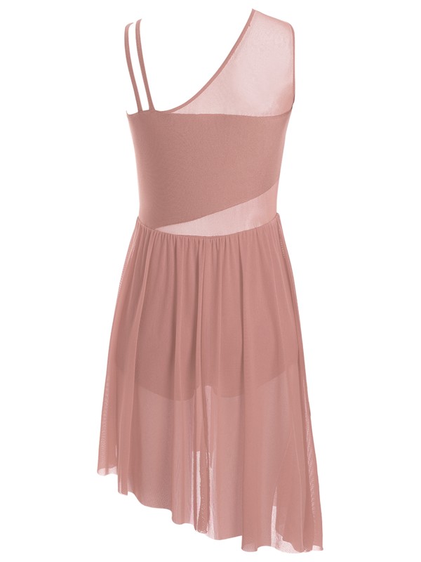 Ein einzigartiges Tanzkleid mit breiten Schulterumfang Trägern auf der einen Seite und doppelten Trägern auf der anderen. Mesh-Details auf Taillenumfang und Rücken.