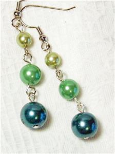 CYNTHIA LYNN "SHADES OF GREEN" GRADUATED GREEN GLASS PEARL SILVER DROP EARRINGS