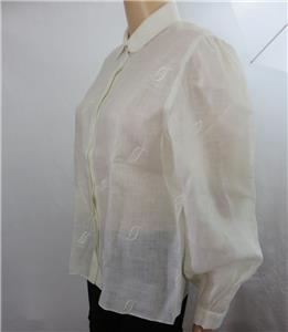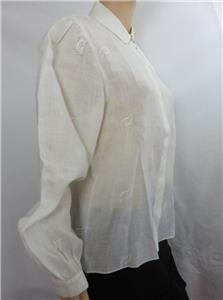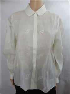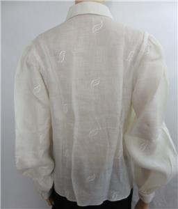 We are offering a Gloria Sachs New York ivory linen blouse. This blouse features a peter pan collar, button down front, bishop sleeve, and leaf shaped embroidered motif. Linen. SZ 12