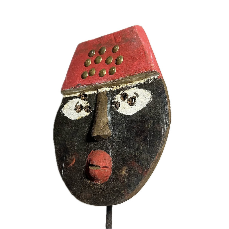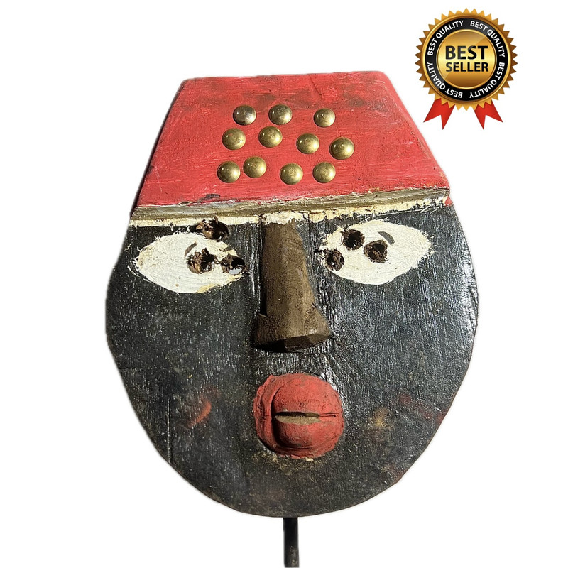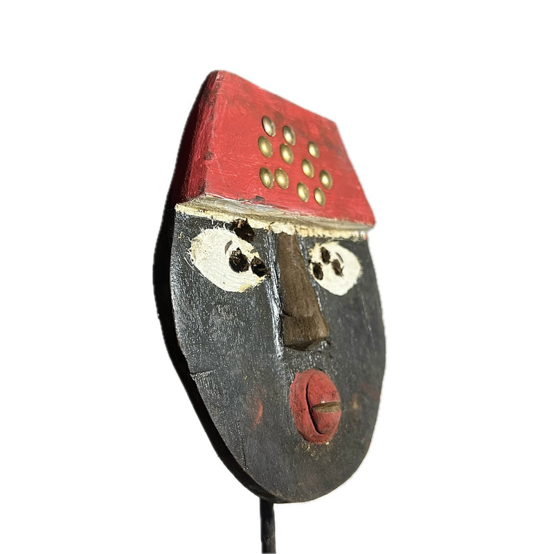 African mask from the Toma people of Guinea, featuring a red-painted crest, brass inlays, and carved ceremonial expression. This distinctive mask is hand-carved with a bold cylindrical mouth and heavy brow, paired with simplified white eye fields and dotted pigment markings. The flat red cap is accented with embedded brass studs—often symbolic of power, protection, or ritual ranking within the Toma Poro society. Painted in a rich black base with red and white contrasts, this piece exemplifies the Toma’s approach to iconographic expression. Used in rites of passage and ancestral reverence, these masks held spiritual and communal power. The facial stylization is intentionally abstract to evoke the presence of spirits rather than realism. Care & Handling Provenance & Authenticity Shipping Measurements:
