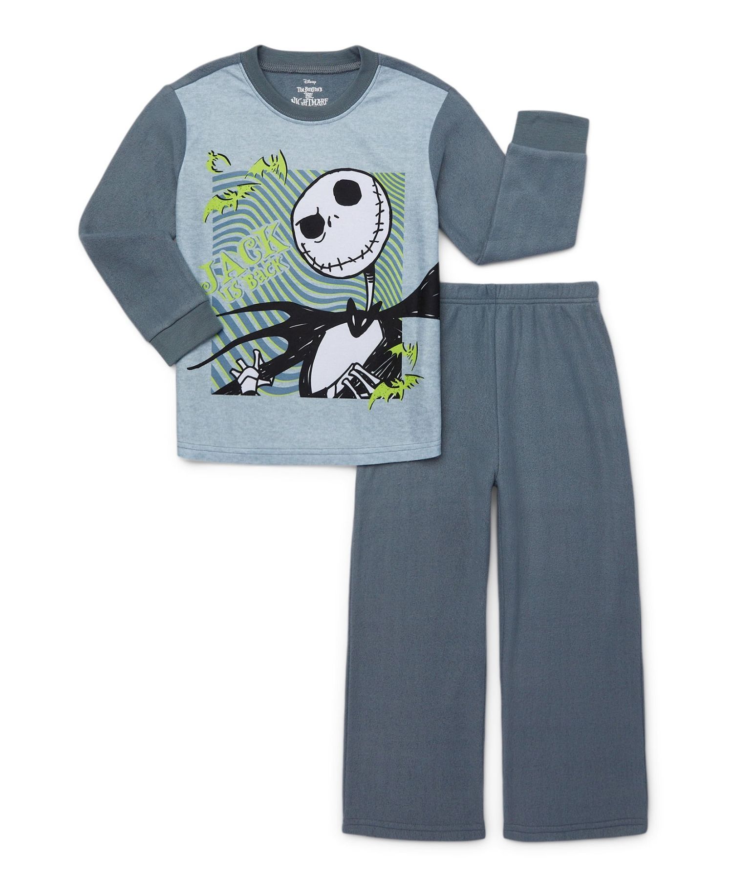 'Jack Is Back' and looking as ghoulishly endearing as ever! Your Jack Skellington fan will be sure to love the classic and fun graphic featuring the king of fright himself. The pajama top has long gray sleeves and a roomy rib-knit collar. Coordinating solid gray pajama pants with an elasticized waistband for a custom fit.