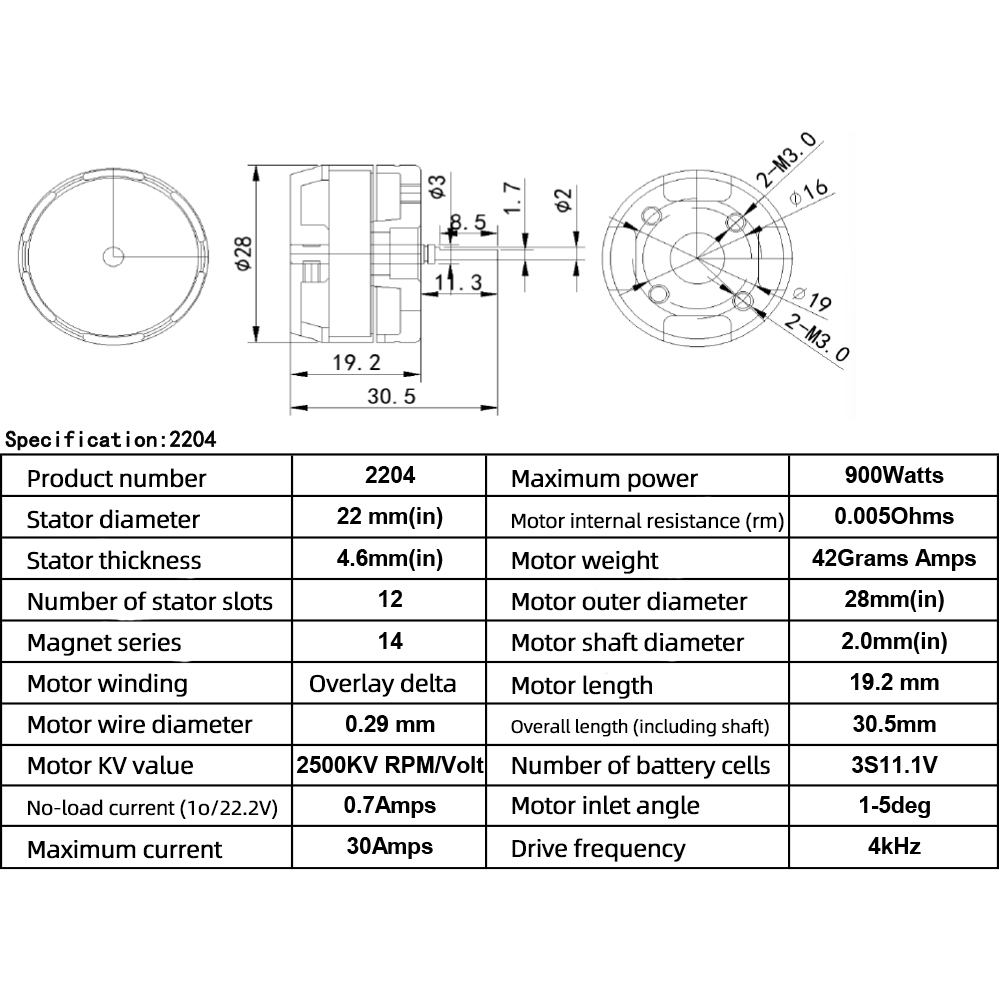 2204-2500KV Motor Specifications: