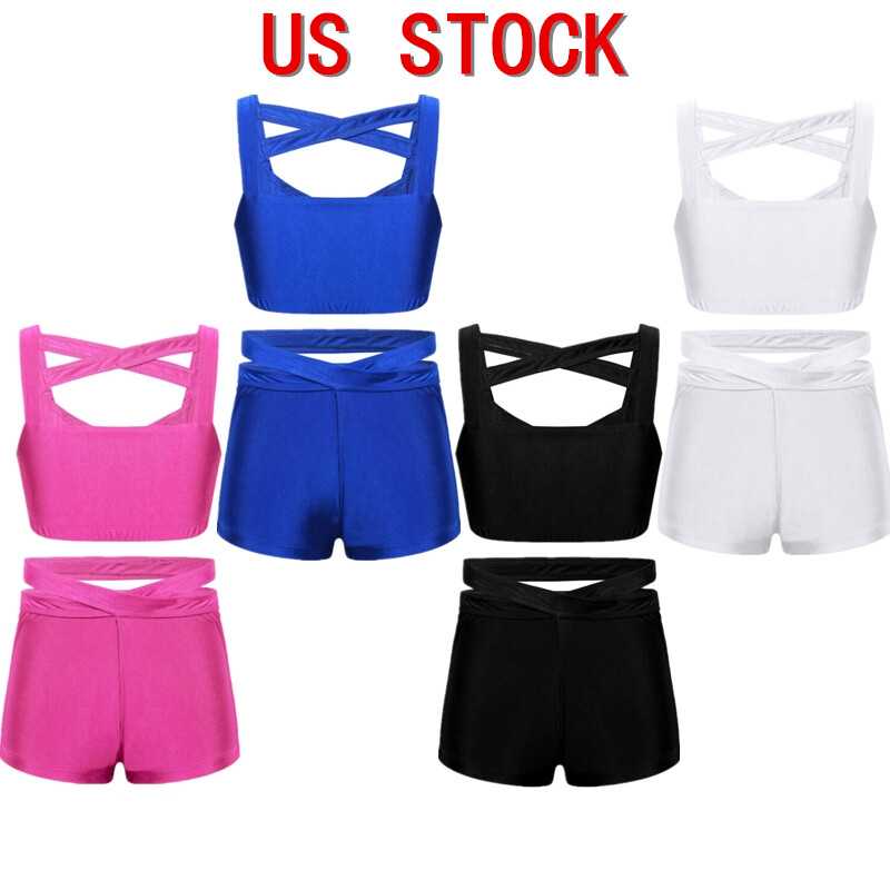 Girl’s crop top with shoulder straps cross at back, elastic hem prevents bounce and ride up.