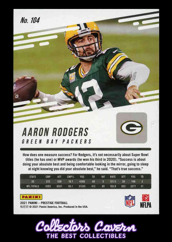2021 Panini Prestige Xtra Points Dots #104 Aaron Rodgers. This card is not graded; but in our opinion in NM or better. Ungraded cards are placed in a card sleeve then top-loader (or Card Saver) and shipped in an envelope.