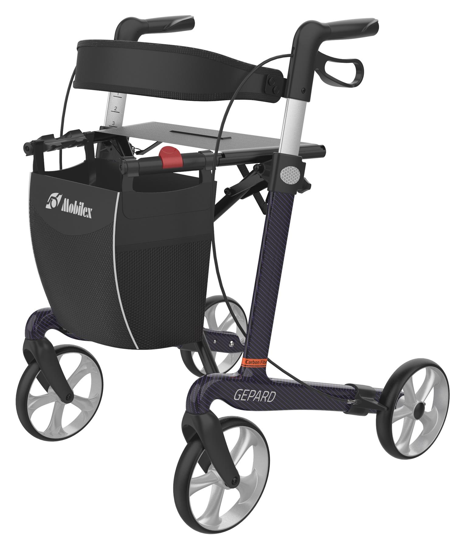 The Mobilex Gepard has a frame made of carbon fibre and aluminium with a purple weave effect, making it one of the lightest rollators on the market today starting from just 5.8Kgs. Although very light, it offers a high degree of stability coupled with extreme ease of movement.
