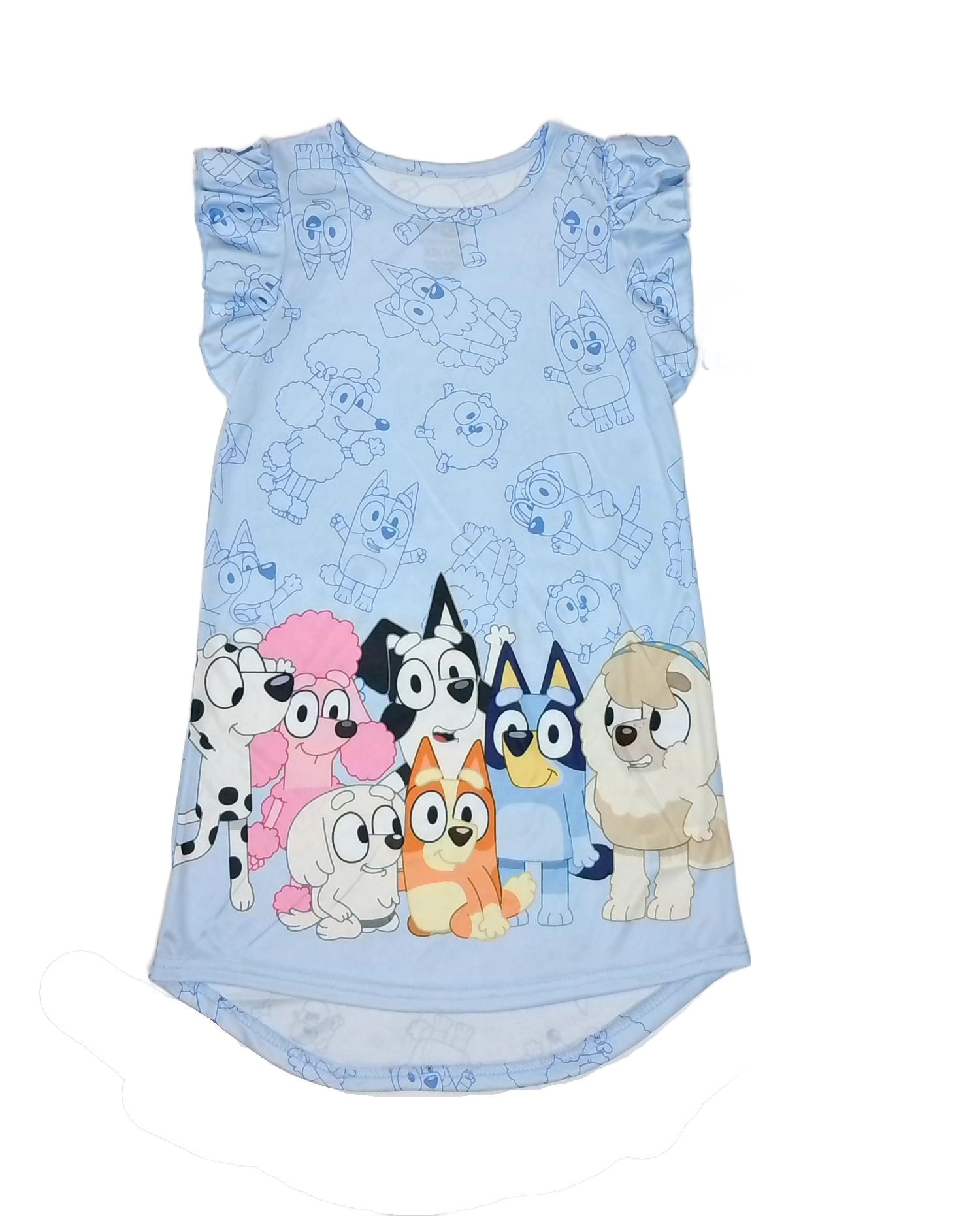 Features a sky blue background with silhouettes of the characters, a roomy neckline, and flutter sleeves that add to the charm. The back features the full print throughout as well.