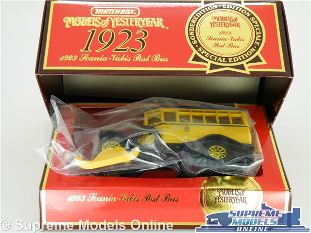 This is a die cast metal Y16 1923 Scania Vabis Post Bus model in yellow made by Matchbox part of the Models Of Yesteryear range. A lovely detailed model, produced a few years ago now back in 1988 !! and long sold out, these are a recent new old stock warehouse find removed from an original trade pack. The model is in new condition and the packaging also is in new condition coming packed in a superb cardboard box, model can easily be removed from the packaging and has rolling wheels, this item would make an excellent addition to your collection and a fantastic display piece. Suitable for ages 14 years +.