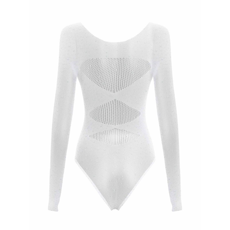 Rhinestone accents enhance the overall glamour of the bodysuit, adding a luxurious and alluring feel.