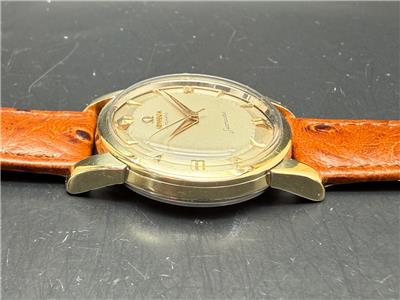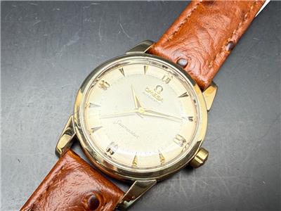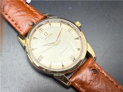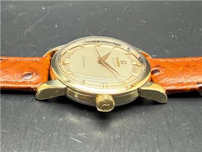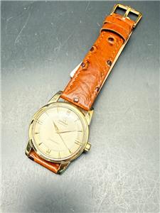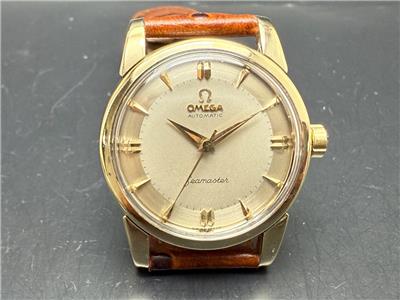 COMMENTS: A VERY GOOD CONDITION VINTAGE OMEGA SEAMASTER WATCH. THE FUNCTIONS PERFECTLY AND KEEPS GREAT TIME. THE GOLD CAPPED STAINLESS STEEL DISPLAY SOME MINOR SCRATCHES MOSTLY ON THE BACK OF THE CASE LUGS. THE RESTORED SILVER 2-TONE DIAL IS IN EXCELLENT SHAPE . THE MOVEMENT HAS BEEN SERVICED RECENTLY AND NEW BANDA LEATHER STRAP AND REPLACEMENT CRYSTAL WERE ALSO INSTALLED DURING THE SERVICE.