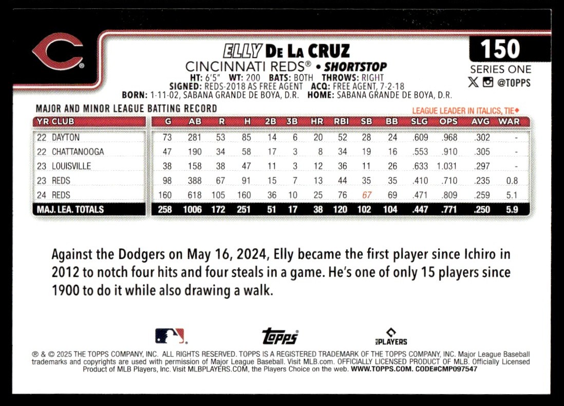 | Elly De La Cruz 2025 Topps Series One Future Stars Card | #150 Cincinnati Reds |