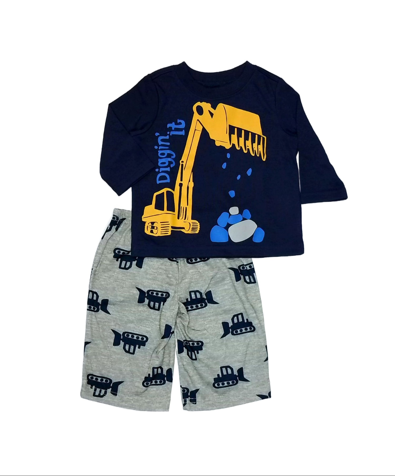 A super cute and comfy pajama set of a polyester jersey A 'Diggin' It' Construction themed long-sleeved pj top. Print pajama pants in gray and navy blue Full elasticized waistband Size 6 Months