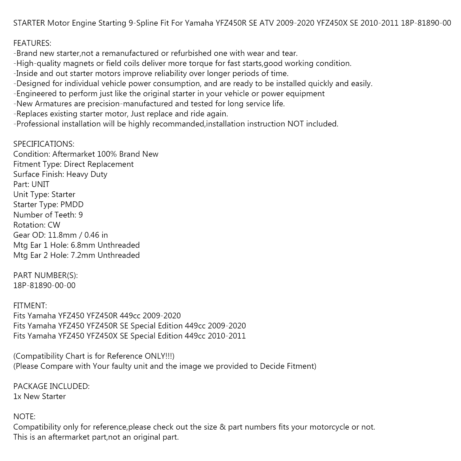 STARTER Motor Engine Starting 9-Spline Fit For Yamaha YFZ450R SE ATV 2009-2020 YFZ450X SE 2010-2011 18P-81890-00