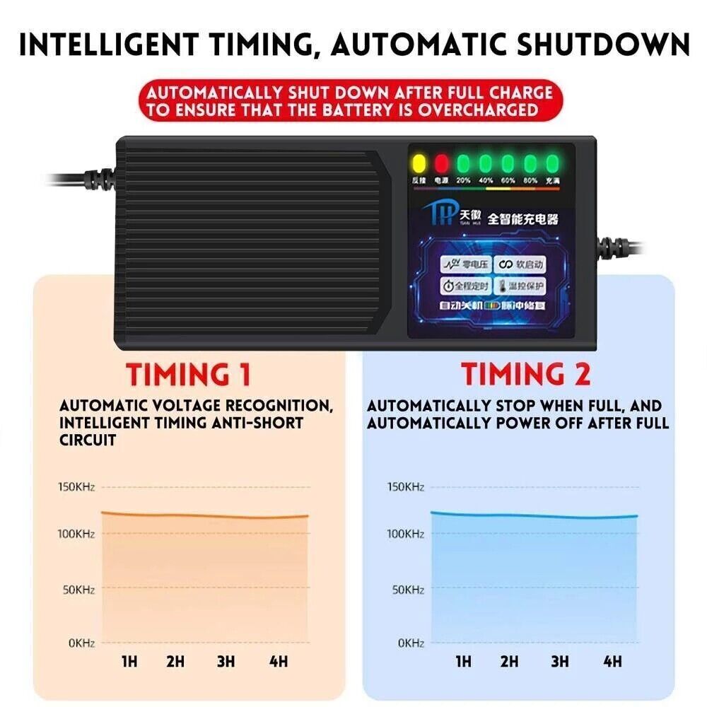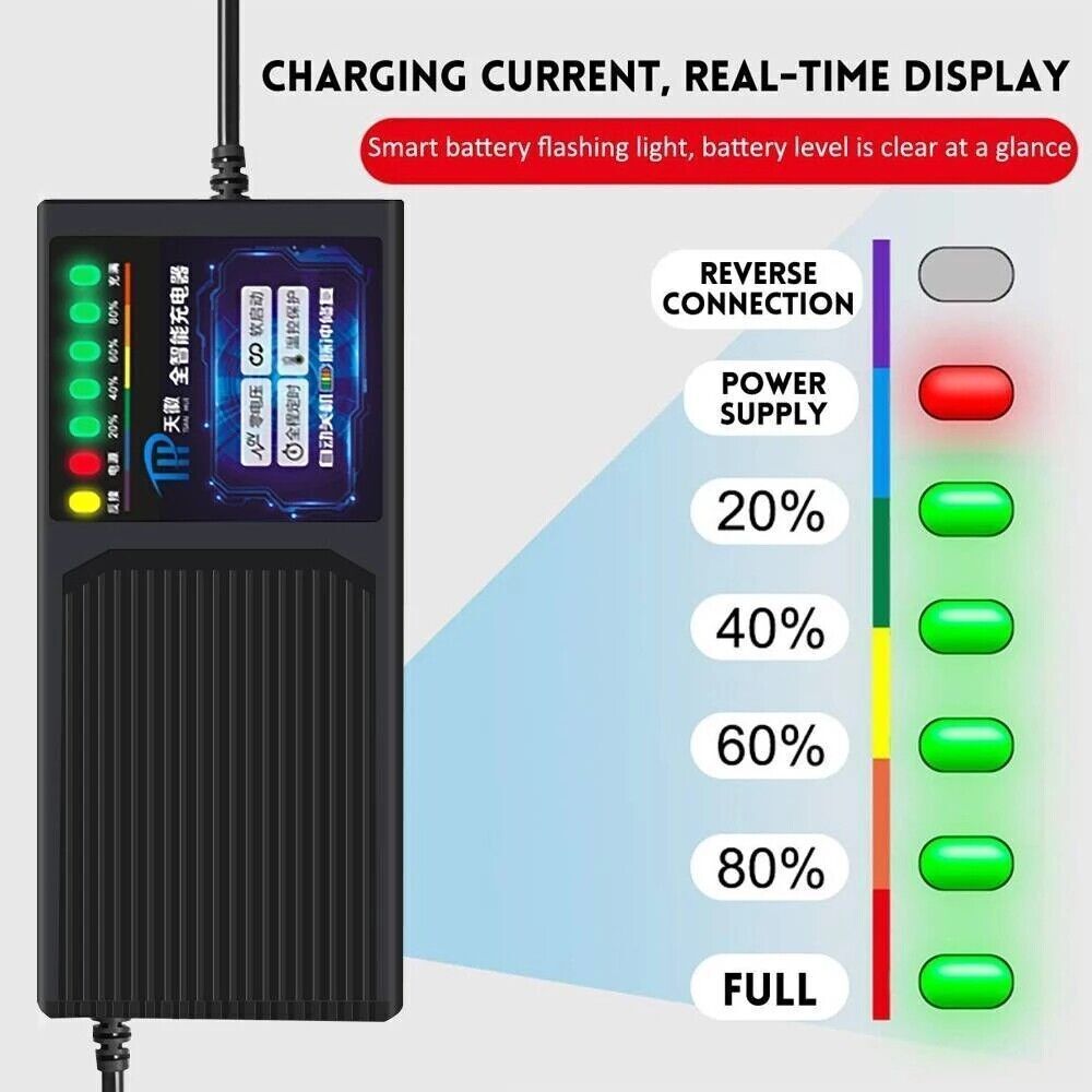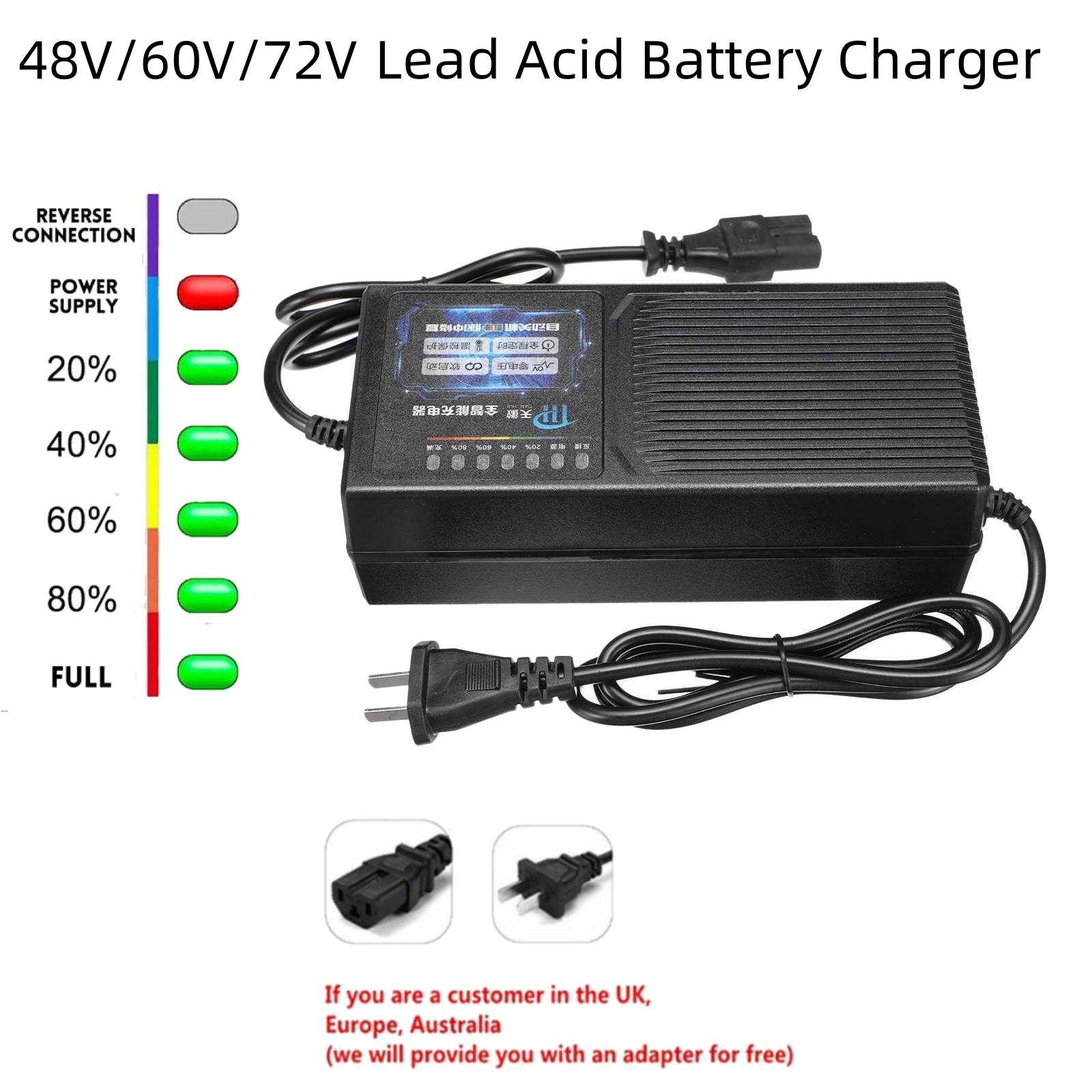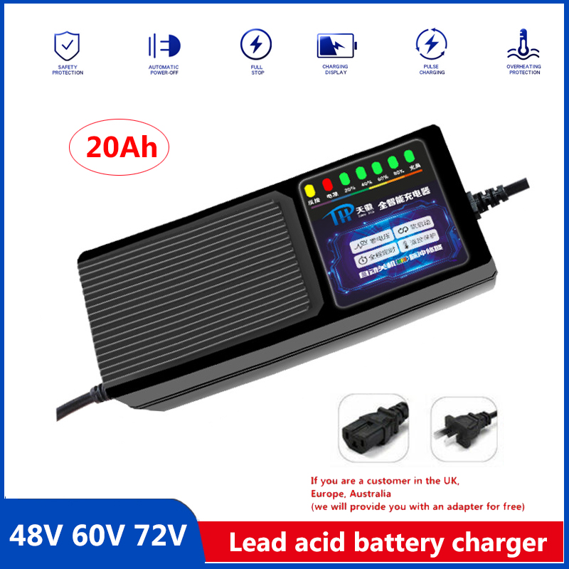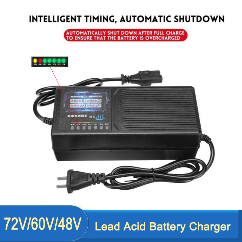 Feature: 1.Intelligent battery flashing light, real-time charging battery display. 2.Fast charging, save charging time and improve efficiency. 3.Over current protection, leakage protection, full pulse, multiple protections. 4.Smart chips, SMT technology and solder chips use smart electronic components. 5.The use of ABS flame retardant shell, fire resistant and strong, allows you to use it more safely. 6.Automatically identify the positive and negative poles and reverse the load zero output. 7.Intelligent timing, automatic shutdown after full charge, to ensure that the battery is overcharged. 8.Temperature compensation, high temperature in summer, automatic shutdown when overheating. Specifications: Name: 7 LED light electric vehicle Lead acid battery charger Colour: Black Shell Materials: Flame Retardant ABS Applicable to: lead-acid battery, not suitable for lithium battery Type: 48V 20AH/20AH 60V/72V 20AH. Output voltage: 48-59V/60-74V/72-88V Output current: 2.6 ± 0.2A Input voltage: 200V-220V 50Hz Battery parameters: 6-DZM-20 Size: 18x8x6cm/7x3x3.5in Package included 1x charger (Distribute the adapter according to your country.)