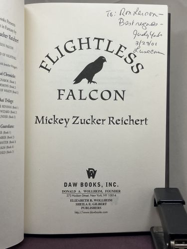 From the flaps: Renowned fantasy author Mickey Zucker Reichert leads readers on a memorable journey into fascinating new territory with her latest fantasy tour de force, Flightless Falcon. Set in a land of scattered rival cities, this is the story of a poignant and dangerous quest, the tale of a man manipulated into a mission against his will in the hopes of regaining the only thing of importance in his life - his family.