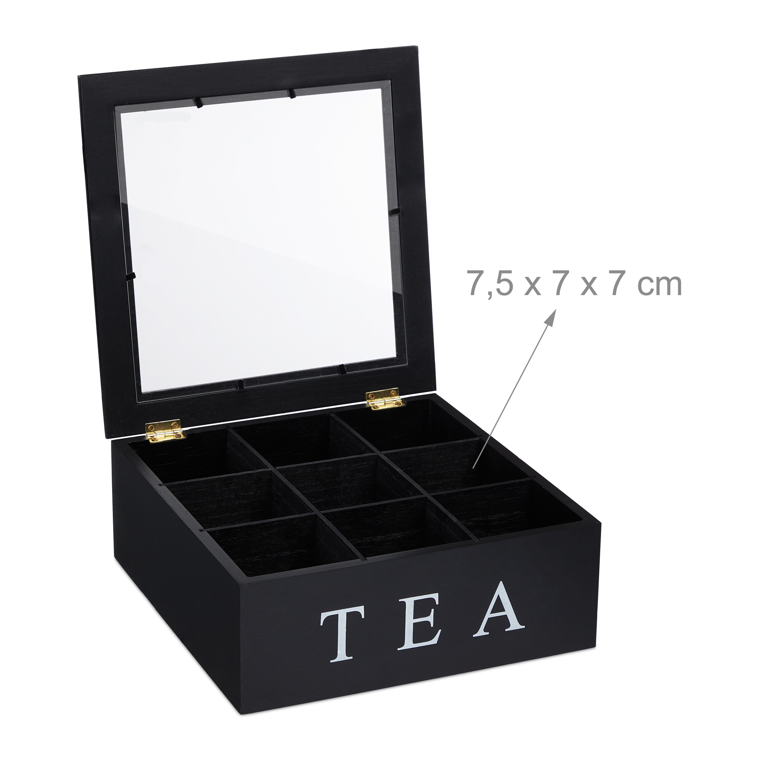 - Details: Maße Teebeutelaufbewahrungsbox HBT: ca. 9 x 23,5 x 23,5 cm - Fächer HBT: ca. 7,5 x 7 x 7 cm