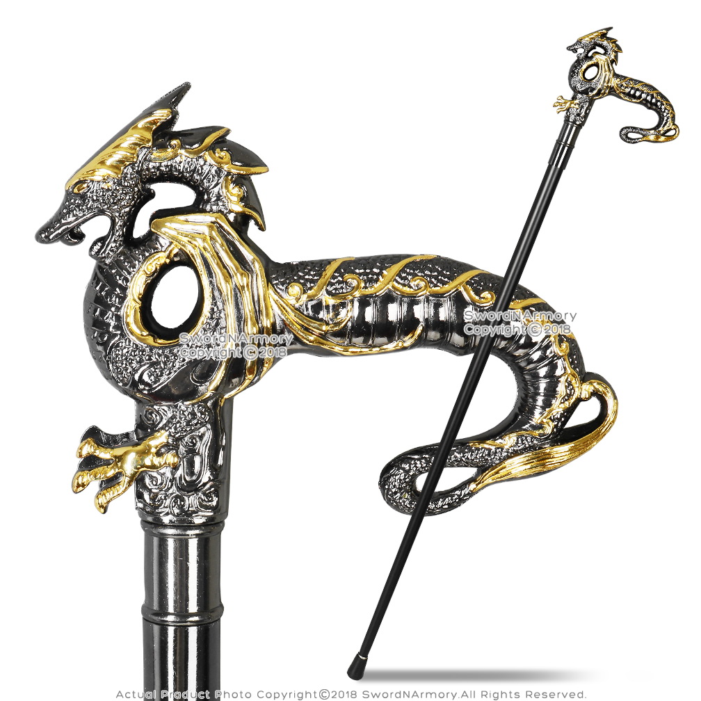 36.5" Black Hound Dog Handle Gold Accented Gentlemen's Walking Cane Stick This is the 36.5" Black Hound Dog Gold Colored Mechanical Skull Gentlemen's Walking Cane. This cane head features a polyresin construction which is painted in matte black with a threaded gold colored base. It is modeled after a hound dog. It comes with a black matte finished steel cane shaft where the head screws onto. The base is covered with a thick black rubber pad. *This walking cane is not a substitute for a medical walking aid device. Please note that this is not a cane sword, there is no sword included with this cane. Attributes of the Cane: -The cane shaft has been constructed from steel with a black matte finish. -The cane features two gold colored metal fittings. -The bottom of the cane features a tough rubber gripper. -The head of the cane has been constructed from polyresin in the shape of a Hound Dog's Head. |