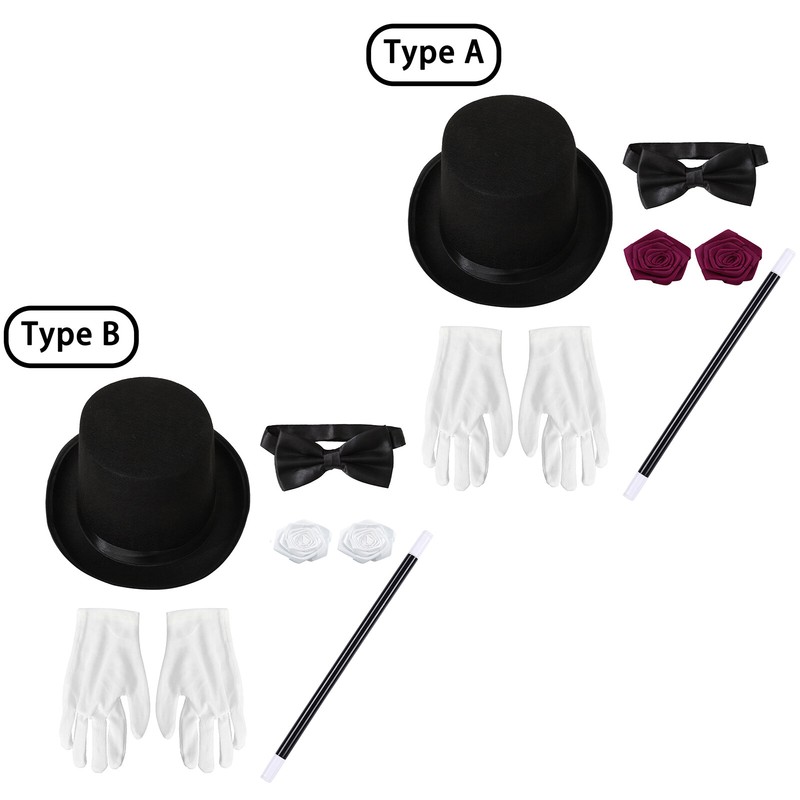 You will get 1pc hat, 1pc bow tie, 1pc magic wand, 2pcs ribbon roses and a pair of gloves. All-in-one accessories meet dress-up party needs.