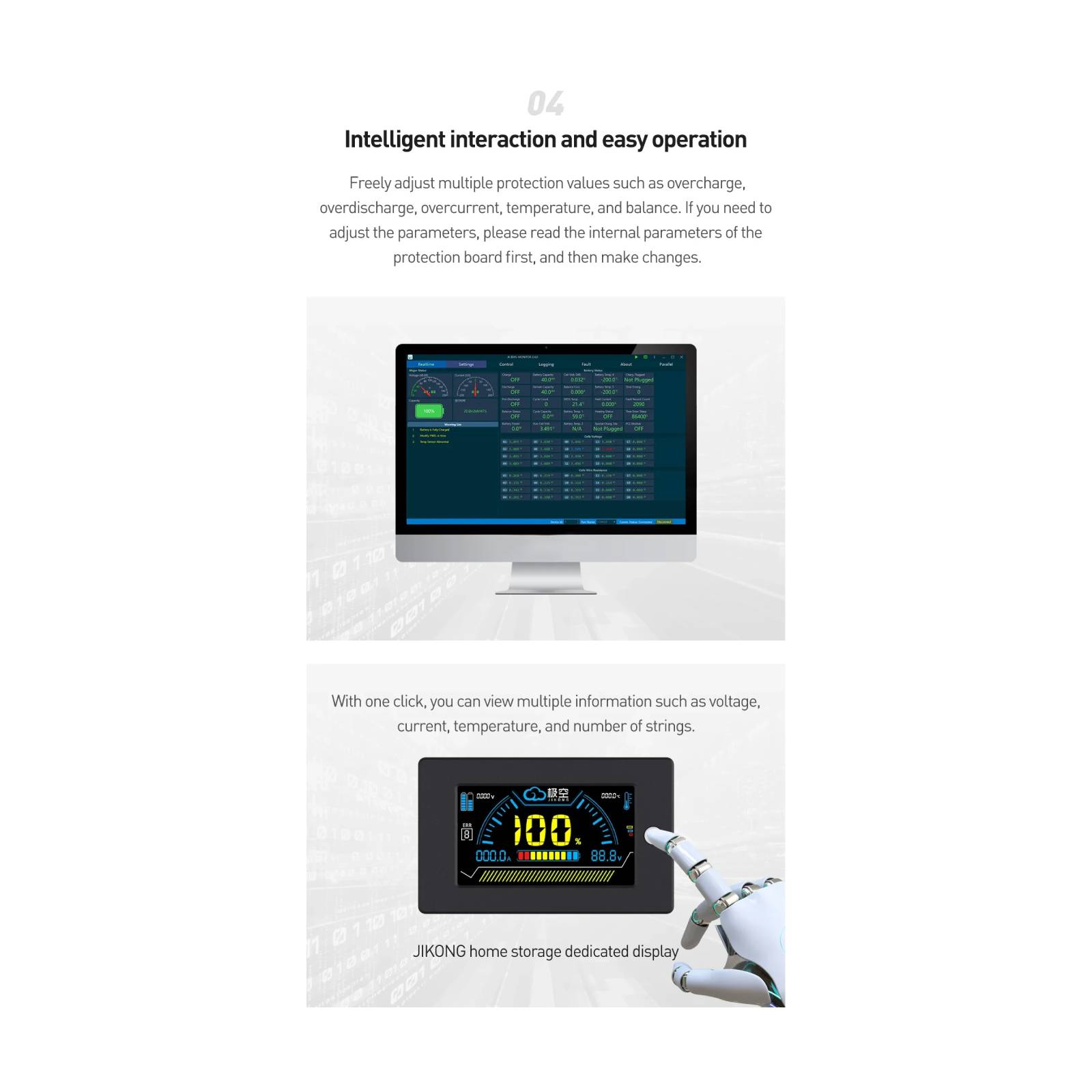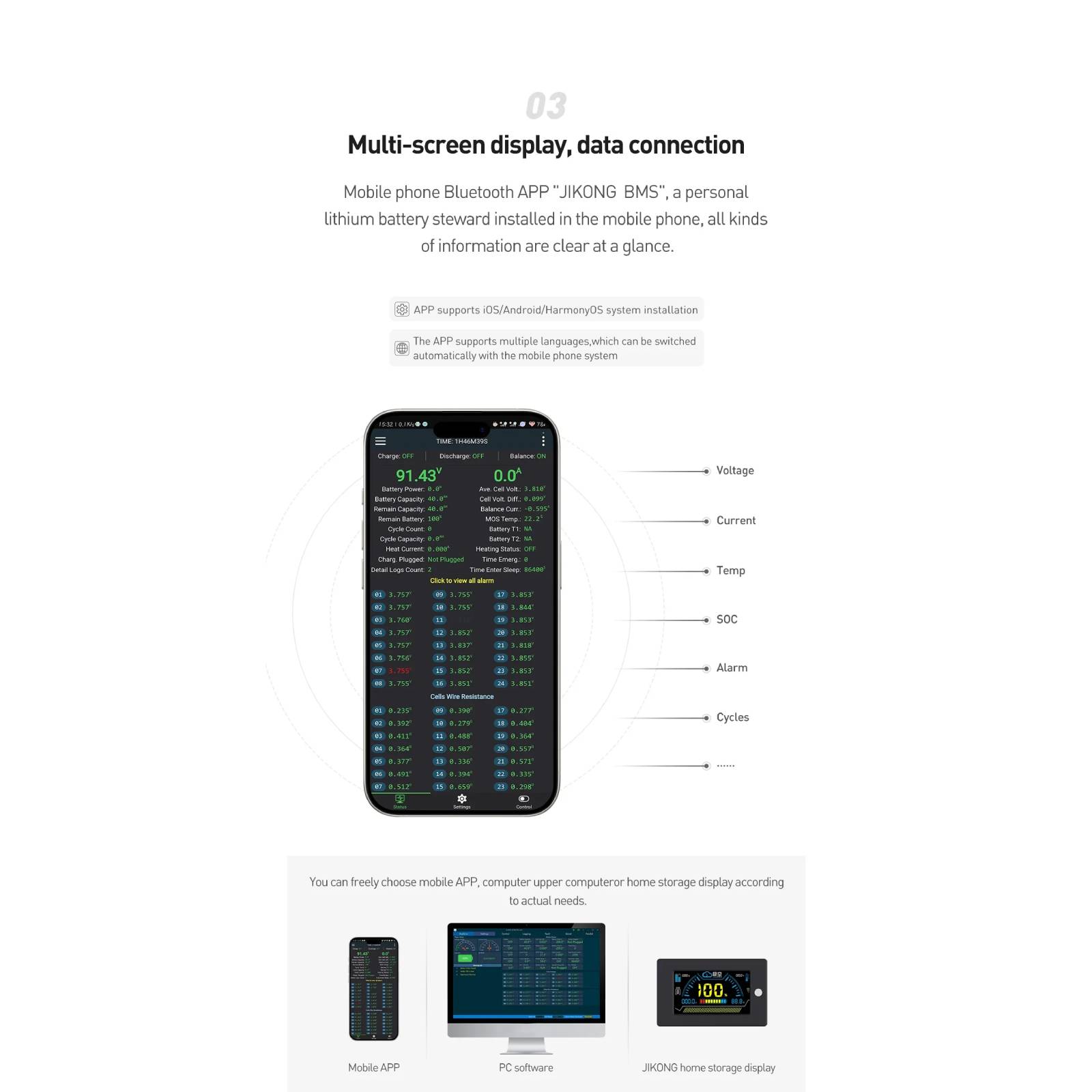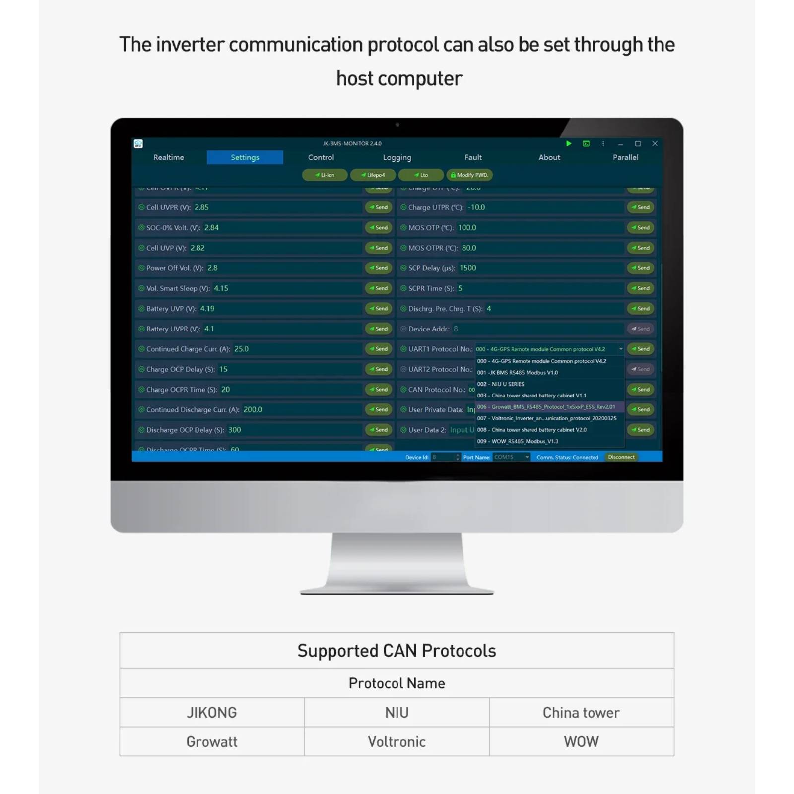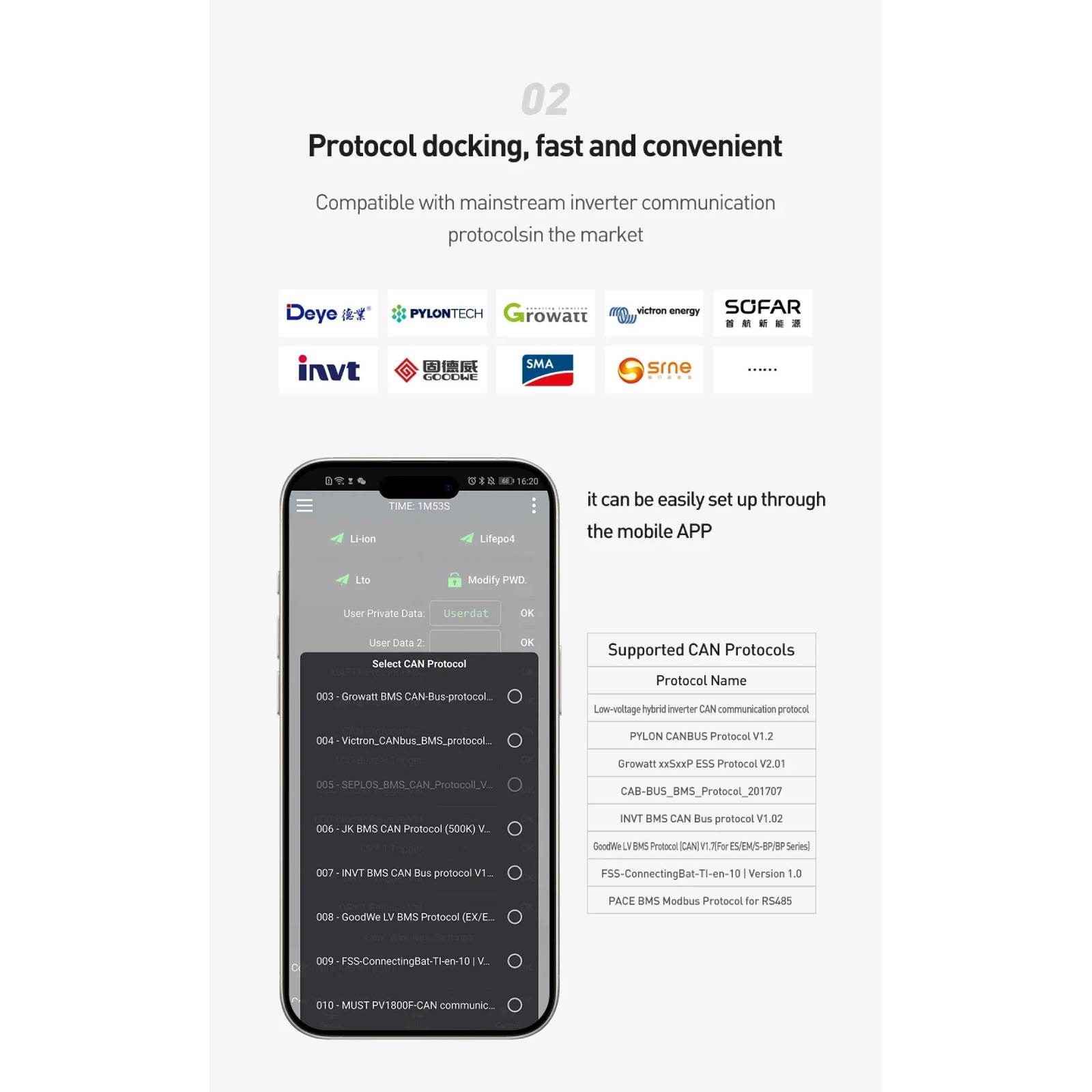 2. We use the CANBUS/RS485 communication protocol to communicate with the inverter, and BMS actively uploads the battery pack data, which is more secure