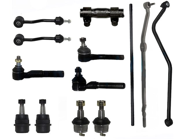 - Kit Includes: (1) Front Right Inner Tie Rod + (2) Front Left Outer Tie Rod + (1) Front Tie Rod Adjusting Sleeve + (1) Front Right Tie Rod Adjusting Sleeve + (1) Front Right Drag Link + (1) Front Track Bar + (2) Front Upper Ball Joint + (2) Front Lower Ball Joint + (2) Front Sway Bar Link